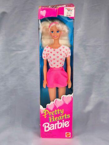 Barbie Pretty Hearts de 1995 es una muñeca que pertenece a la emblemática línea Barbie. Esta Barbie destaca por su conjunto de falta rosa y camiseta blanca adornada con estampados de corazones que irradian encanto y dulzura. Su conjunto incluye pendientes y zapatos que complementan su atuendo a la perfección. Lleva el cabello rubio y largo, peinado con ligeras ondas, y sus ojos son de color azul. Es una adición maravillosa para cualquier colección de Barbie, llena de amor y estilo.