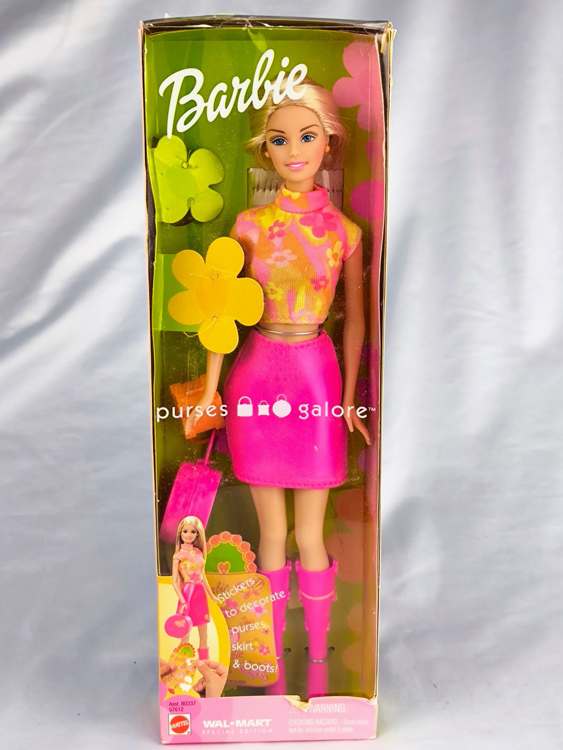 Barbie Purses Galore (2002) es una edición especial de Barbie lanzada por Mattel en 2002. Esta Barbie lleva un atuendo muy llamativo y elegante. Ella luce una blusa sin mangas de cuello alto con un diseño floral en colores rosa, amarillo y naranja. Complementa su look con una falda corta de color rosa brillante y botas altas del mismo color. Además, la caja incluye accesorios como un bolso rosa y pegatinas para decorar la falda, el bolso y las botas.