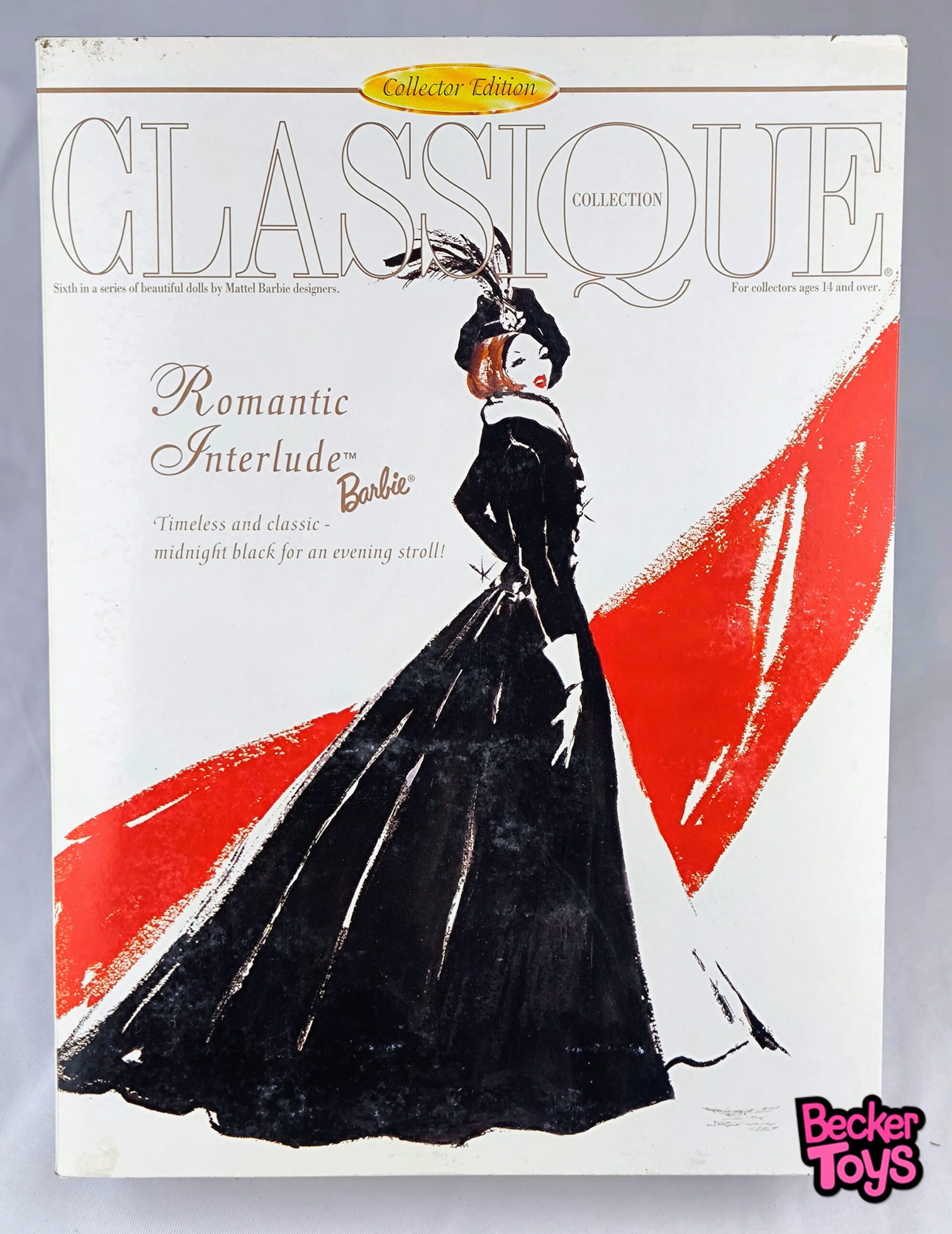 La Barbie Romantic Interlude de 1996 es parte de la colección Classique y es la sexta en la serie. Diseñada por Ann Driskill, esta muñeca lleva un elegante conjunto de terciopelo negro que incluye un abrigo largo con botones de pedrería y detalles en blanco en el cuello y los puños. También lleva un beret negro con un pin de pedrería y plumas, y botas altas negras.