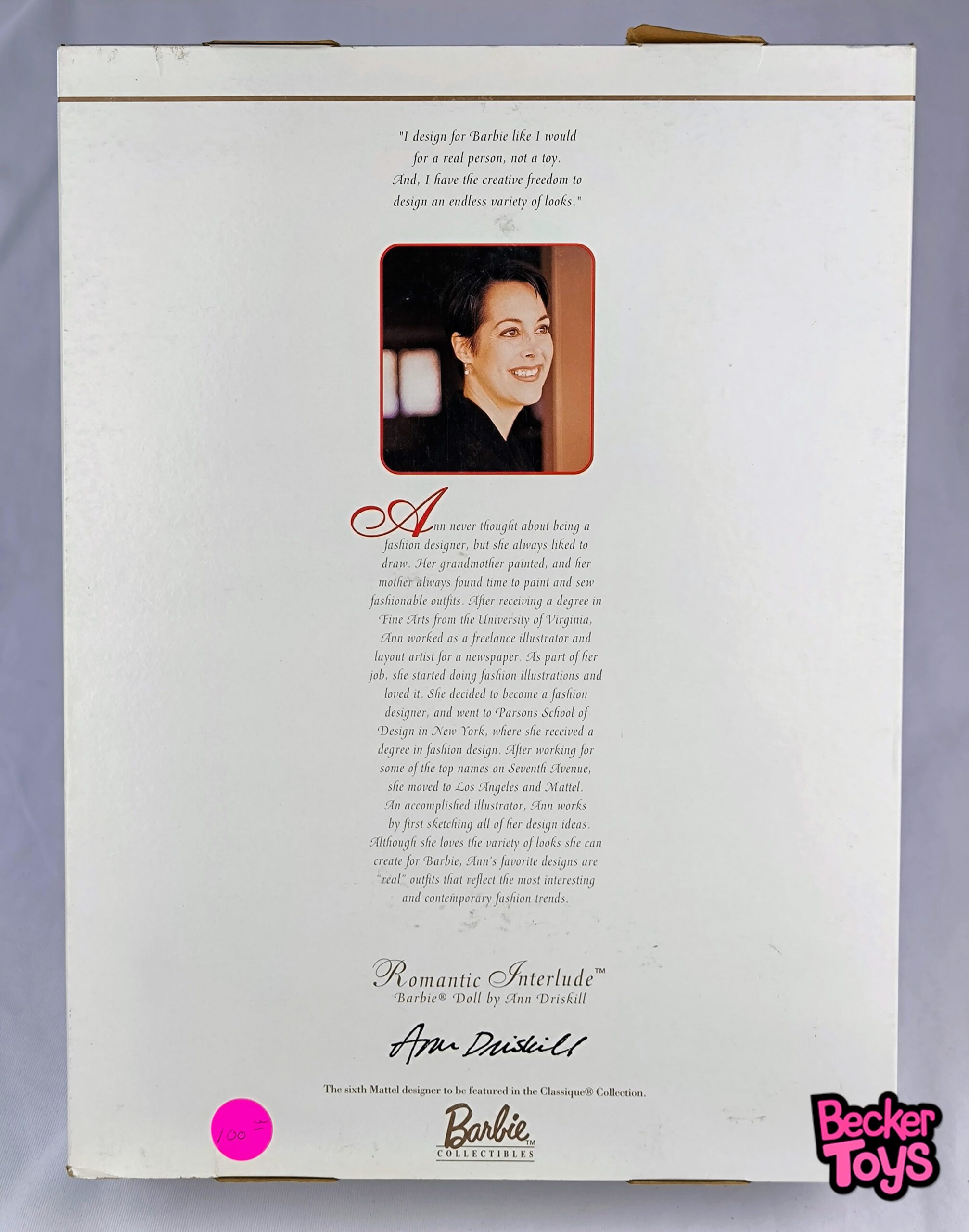 Muñeca de colección Classique – Barbie Romantic Interlude de 1996 de Ann Driskill. Nueva, nunca sacada de la caja. Caja con daños por humedad en una esquina, no afecta a la muñeca.