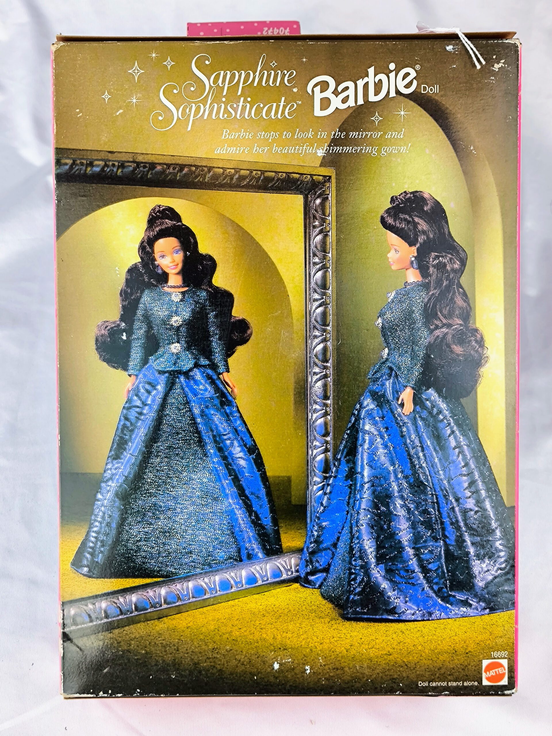 Barbie Sapphire Sophisticate de 1997 es una edición especial que destaca por su elegancia y sofisticación. Esta muñeca luce un vestido largo azul zafiro con detalles brillantes y un diseño que evoca glamour y estilo. Su cabello está peinado en un recogido clásico, complementado con accesorios como pendientes y un collar que realzan su apariencia refinada.