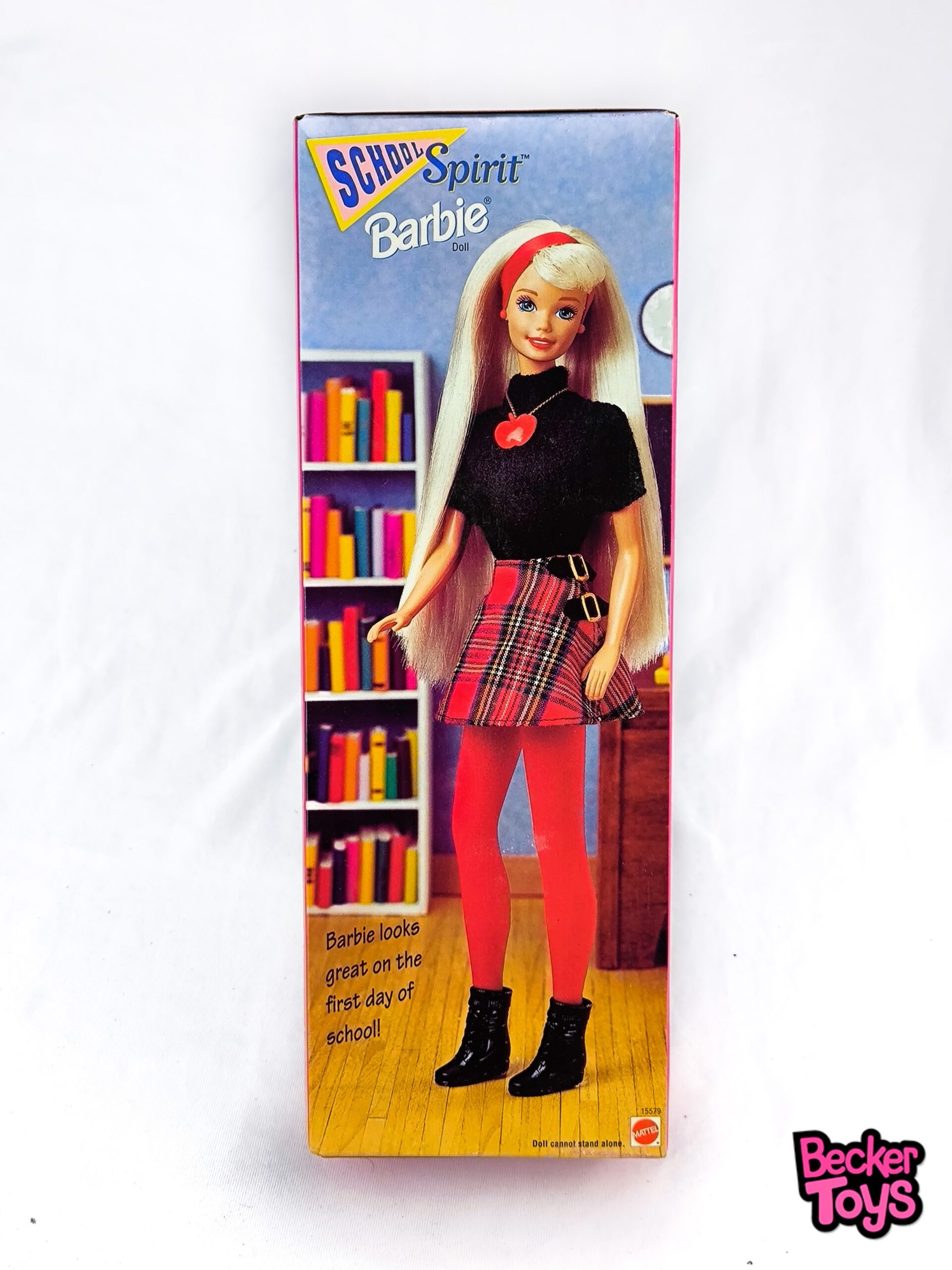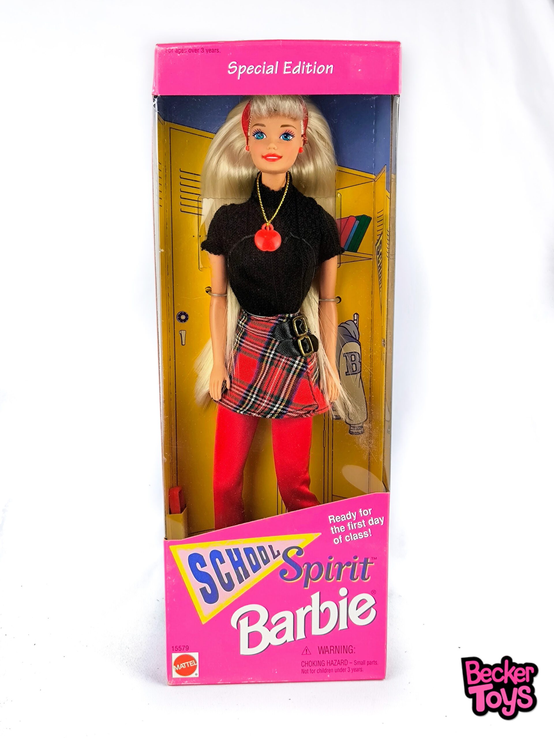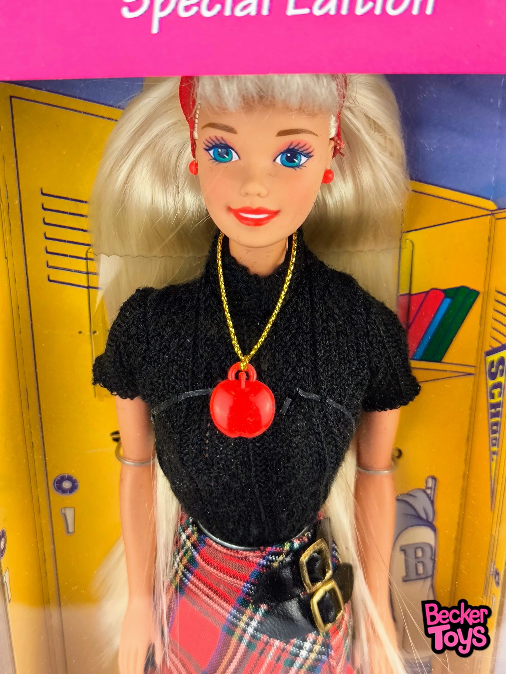 Esta edición especial de Barbie, lanzada en 1995, está diseñada para mostrar el espíritu escolar. Barbie viene vestida con un conjunto moderno y juvenil que incluye una blusa negra de punto, una minifalda de cuadros, y medias rojas. Completa su look con un lazo rojo en el cabello, botas negras y accesorios como pendientes y un collar con forma de manzana.