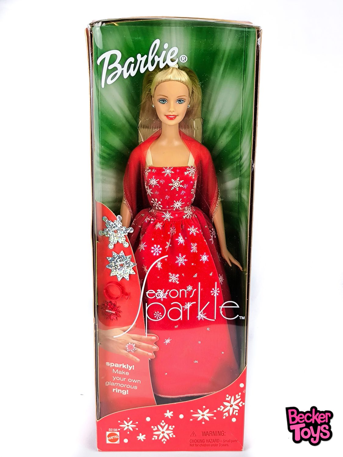 Barbie Seasons Sparkle es una muñeca Barbie lanzada en 2001 como una edición especial de navidad. Esta Barbie está vestida con un hermoso vestido de fiesta con detalles brillantes y un toque festivo. Lleva un vestido rojo largo y elegante con un diseño de estrellas y un lazo en el cabello. Su cabello es de color rubio y está peinado en un estilo recogido con un lazo decorativo.