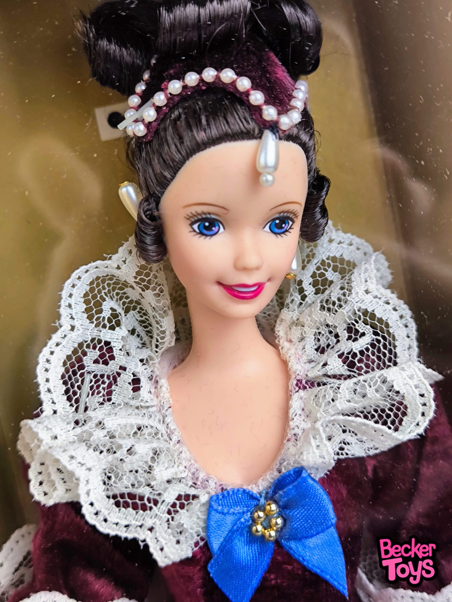 Barbie Sentimental Valentine de 1996 es una edición especial que conmemora el Día de San Valentín con un estilo romántico y encantador. Esta Barbie luce un elegante vestido de terciopelo burdeos, adornado con delicado encaje blanco, que realza su elegancia y feminidad.