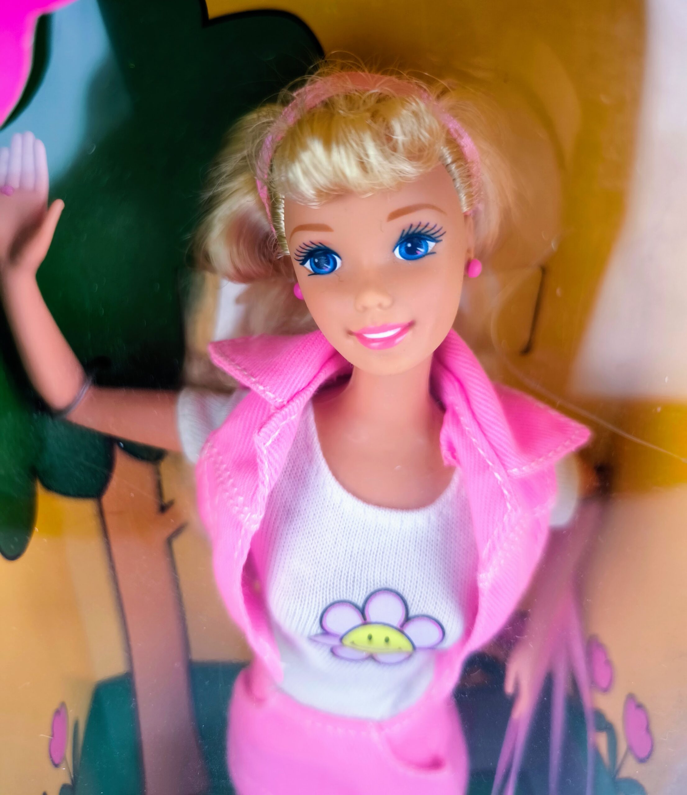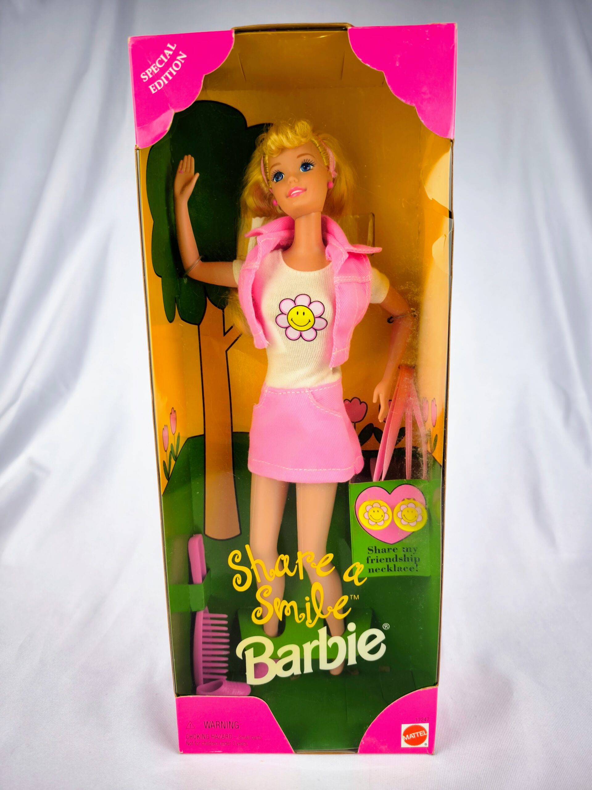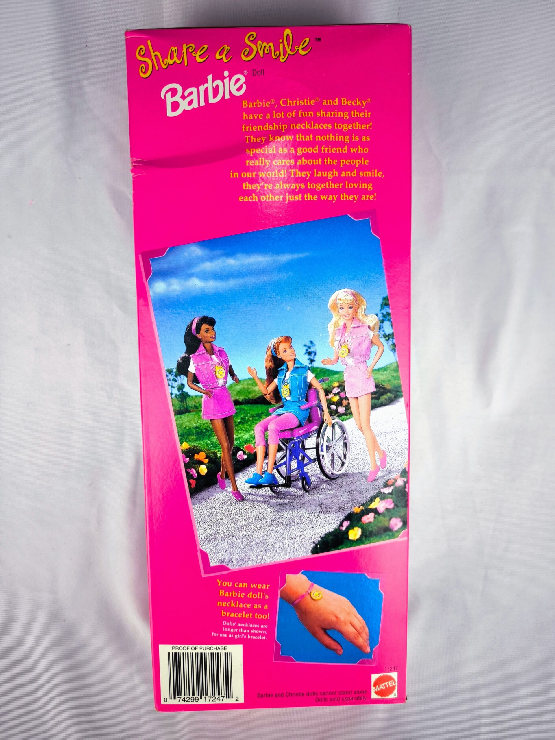 Barbie Share A Smile 1996 es una edición especial de Barbie lanzada por Mattel como parte de la serie «Share A Smile». Esta edición incluye a Barbie Becky, que viene con una silla de ruedas. La muñeca tiene el cabello rubio y los ojos azules. Está vestida con una camiseta blanca con una flor sonriente estampada, falda y chaqueta corta de color rosa claro, y un felpa rosa en el cabello. Además, trae un collar y una pulsera para niñas.