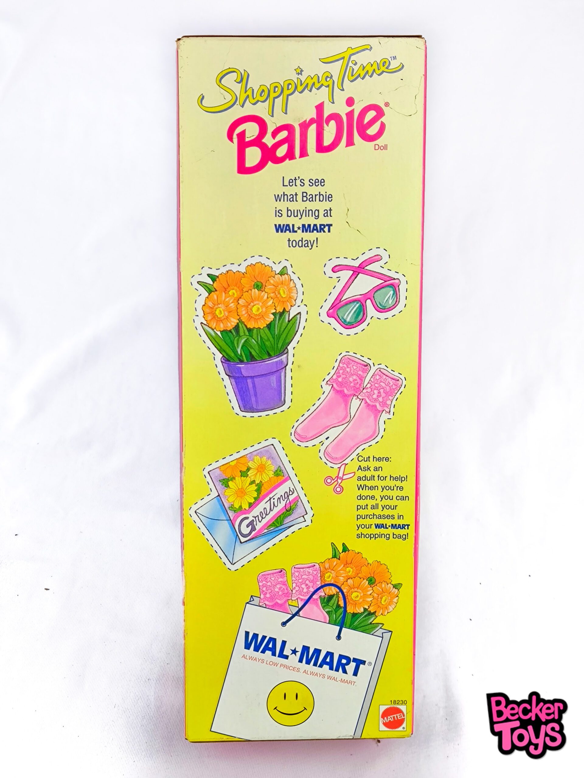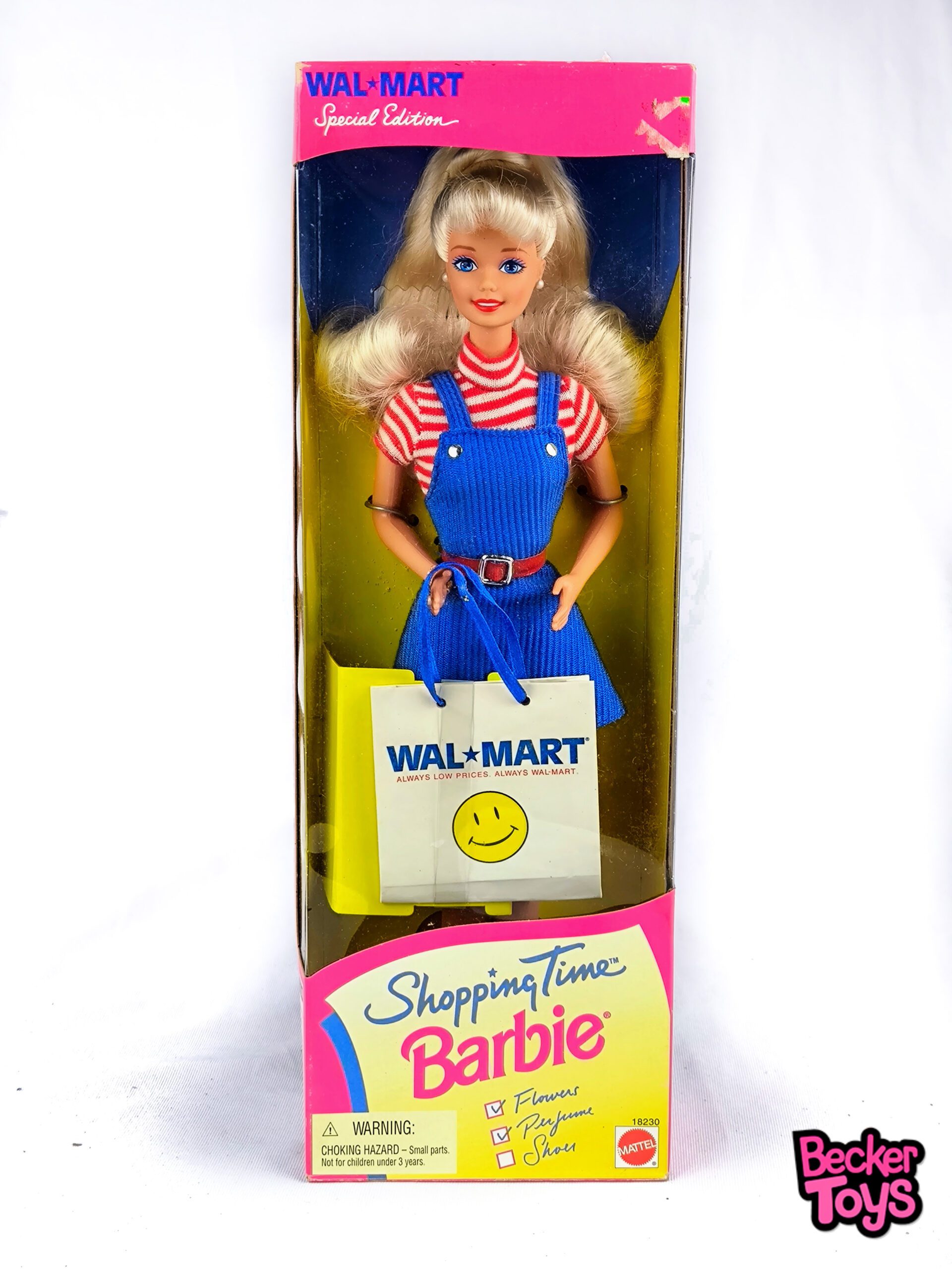 Barbie Shopping Time Walmart es una edición especial de Barbie lanzada en 1997 por Mattel. Esta Barbie viene vestida con un jumper de pana azul y una camisa a rayas rojas y blancas. Lleva una bolsa de compras de Walmart para guardar todos los artículos que encuentra. Es una muñeca ideal tanto para coleccionistas como para niños. Además, esta Barbie nunca ha sido retirada de su caja y viene con una etiqueta especial de Walmart.
