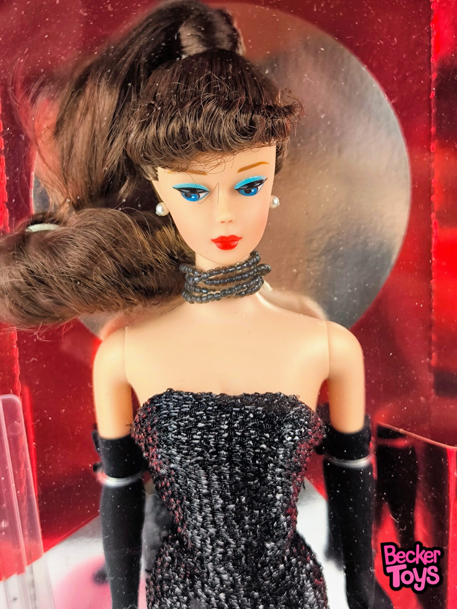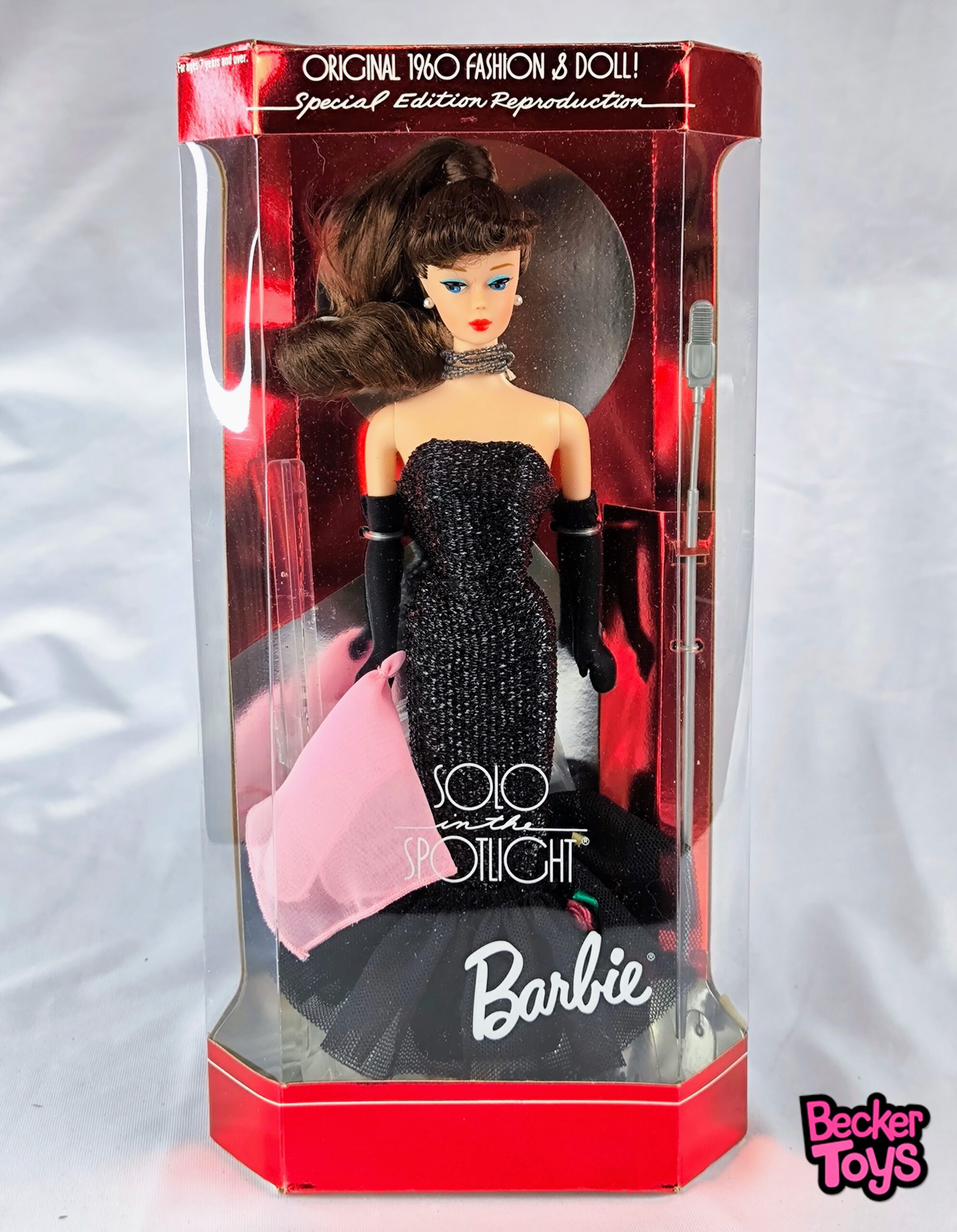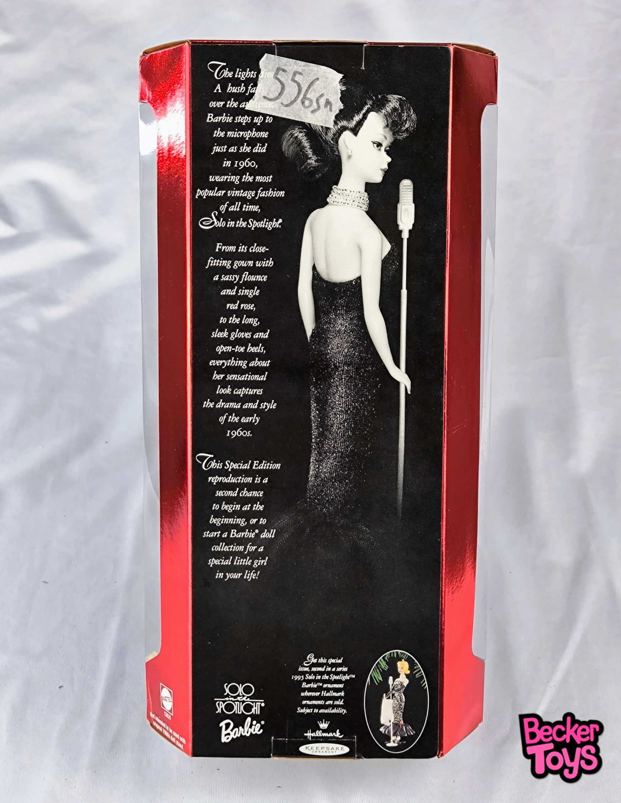 Barbie «Solo in the Spotlight» de 1994 es una edición especial que rinde homenaje al glamour clásico de los años 60. Esta muñeca presenta un vestido negro ajustado con un acabado brillante, acompañado de un pañuelo de gasa, guantes largos, un collar y pendientes elegantes. Incluye un micrófono vintage y un soporte para la muñeca, lo que refuerza su temática de estrella en el escenario. Es una pieza de colección muy buscada por los amantes de Barbie y los entusiastas de los artículos retro