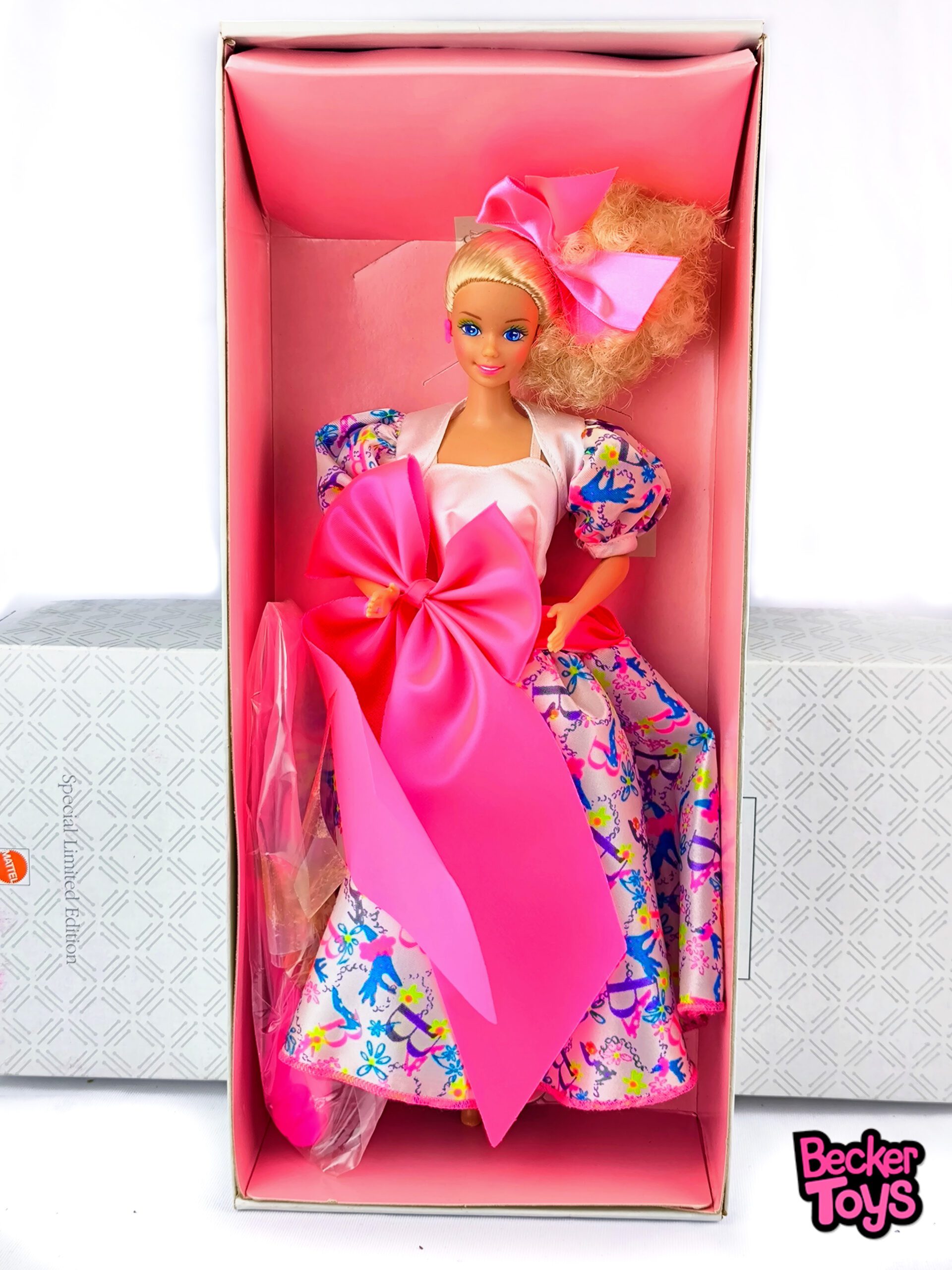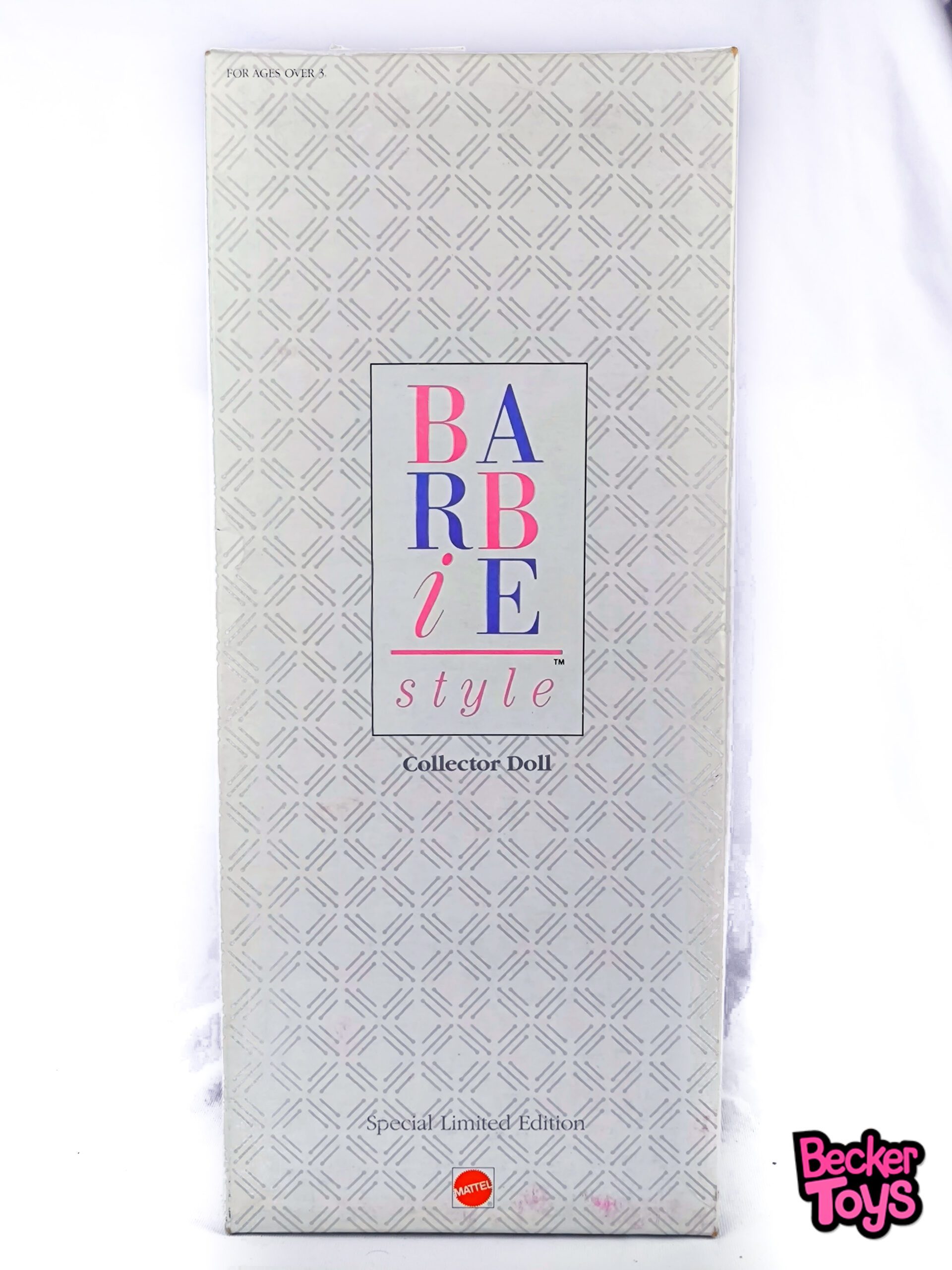Barbie Style de 1990 es una edición especial que celebra la moda y el estilo de esa década. Esta Barbie lleva un vestido multicolor con patrones noventeros y con un lazo rosa enorme muy característico en la cintura, y su cabello rubio está peinado en un estilo desenfadado y juvenil.