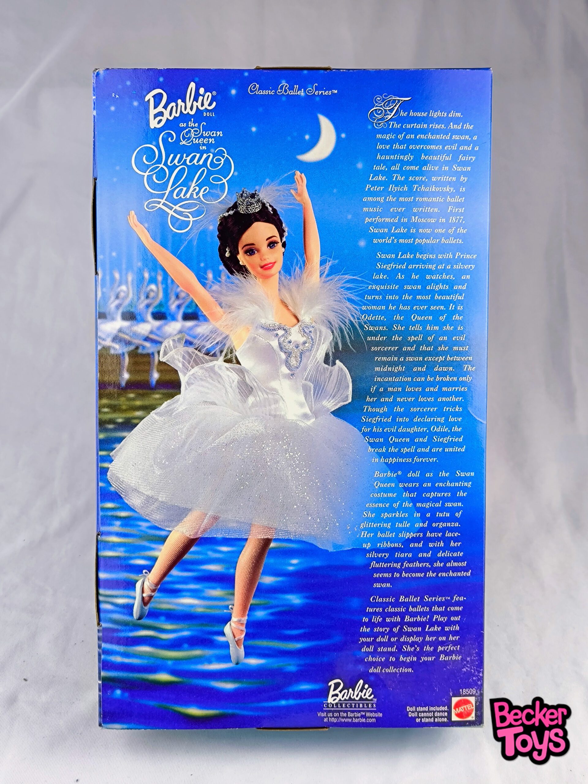 La Barbie Swan Queen de 1997 es una muñeca coleccionable que rinde homenaje al icónico ballet El Lago de los Cisnes. Esta Barbie forma parte de la Classic Ballet Series™ y se presenta con un traje de bailarina brillante que captura la delicadeza y gracia del personaje que representa.