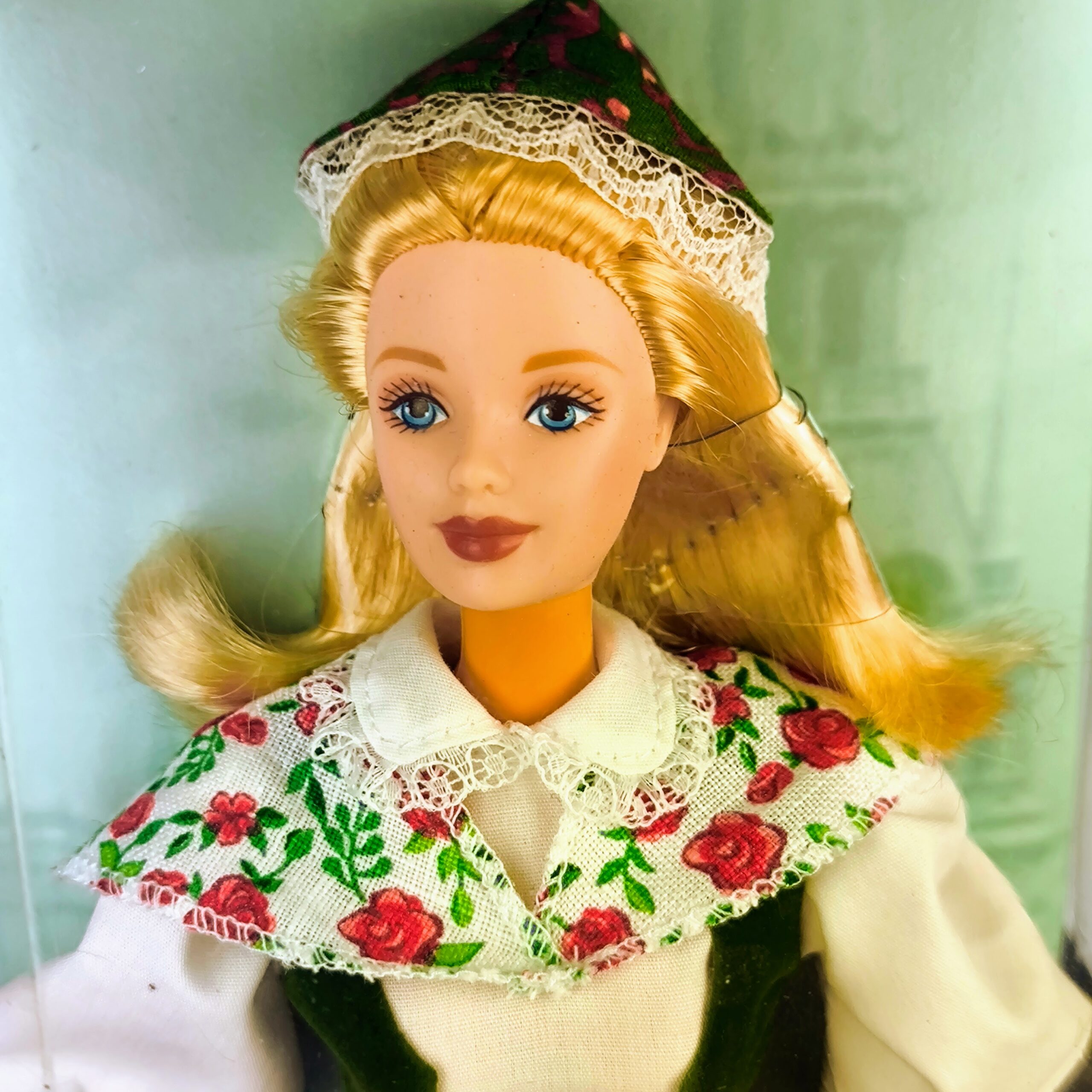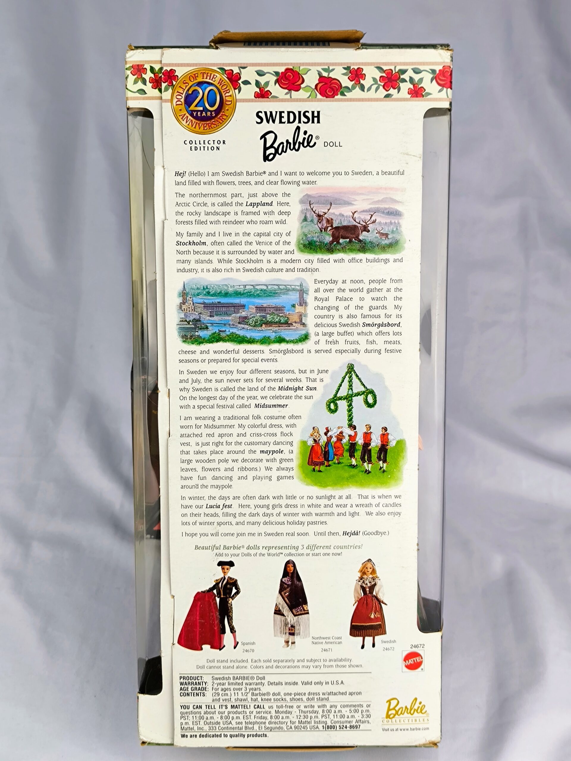 Barbie Sueca de 1999 es parte de la colección «Muñecas del Mundo» de Mattel. Esta Barbie es mucho más que una simple muñeca—es un ícono cultural. Está vestida con un detallado traje folclórico sueco, que es común ver durante las festividades de verano en Laponia. Su atuendo incluye un vestido de una pieza con delantal y chaleco adheridos, un hermoso chal, un sombrero, calcetines hasta la rodilla y zapatos. Su vestimenta refleja el encanto y la gracia del patrimonio escandinavo. La muñeca viene en su empaque original, que presenta un fondo escénico de Suecia, añadiendo un toque extra de autenticidad a la experiencia. Además, incluye peana.