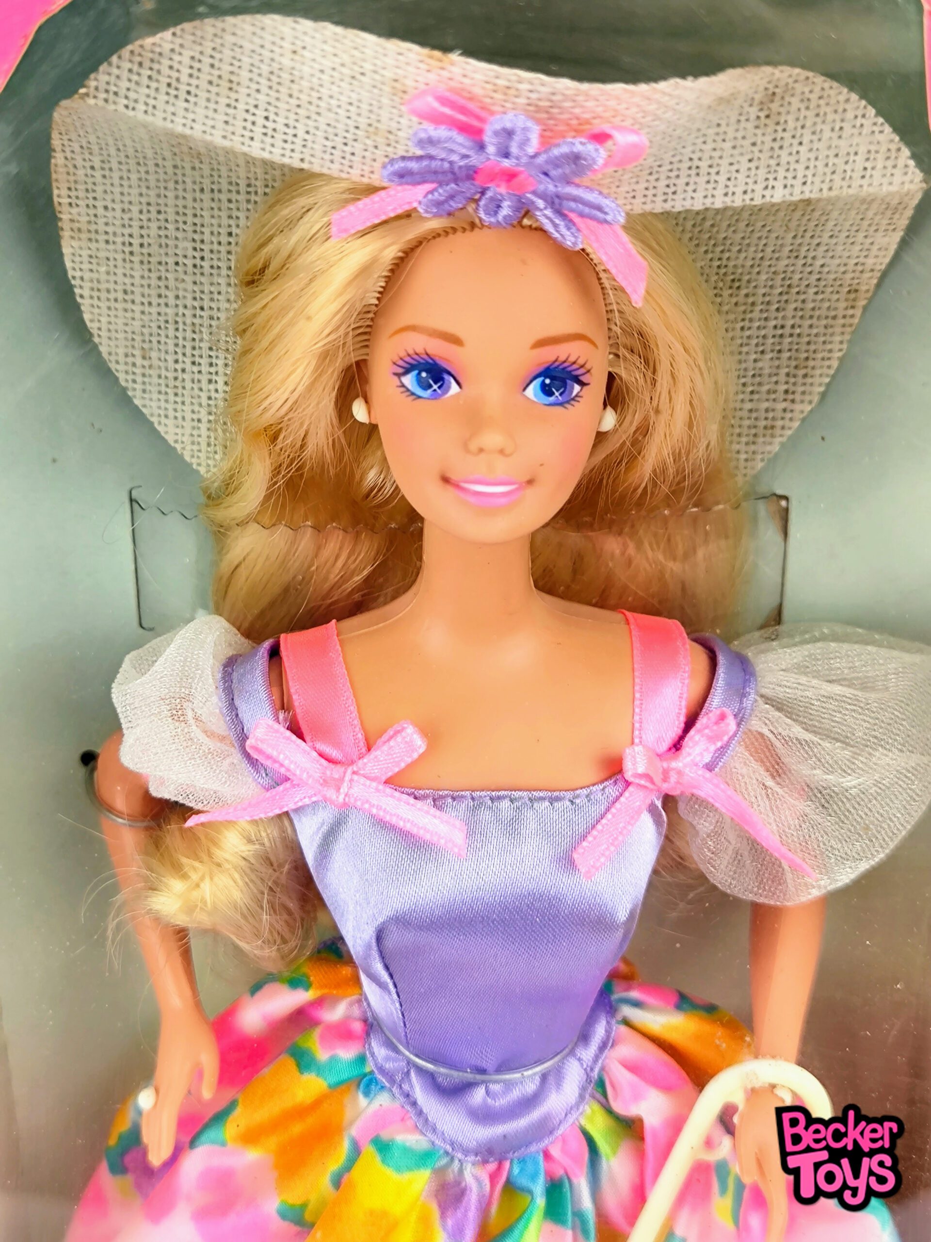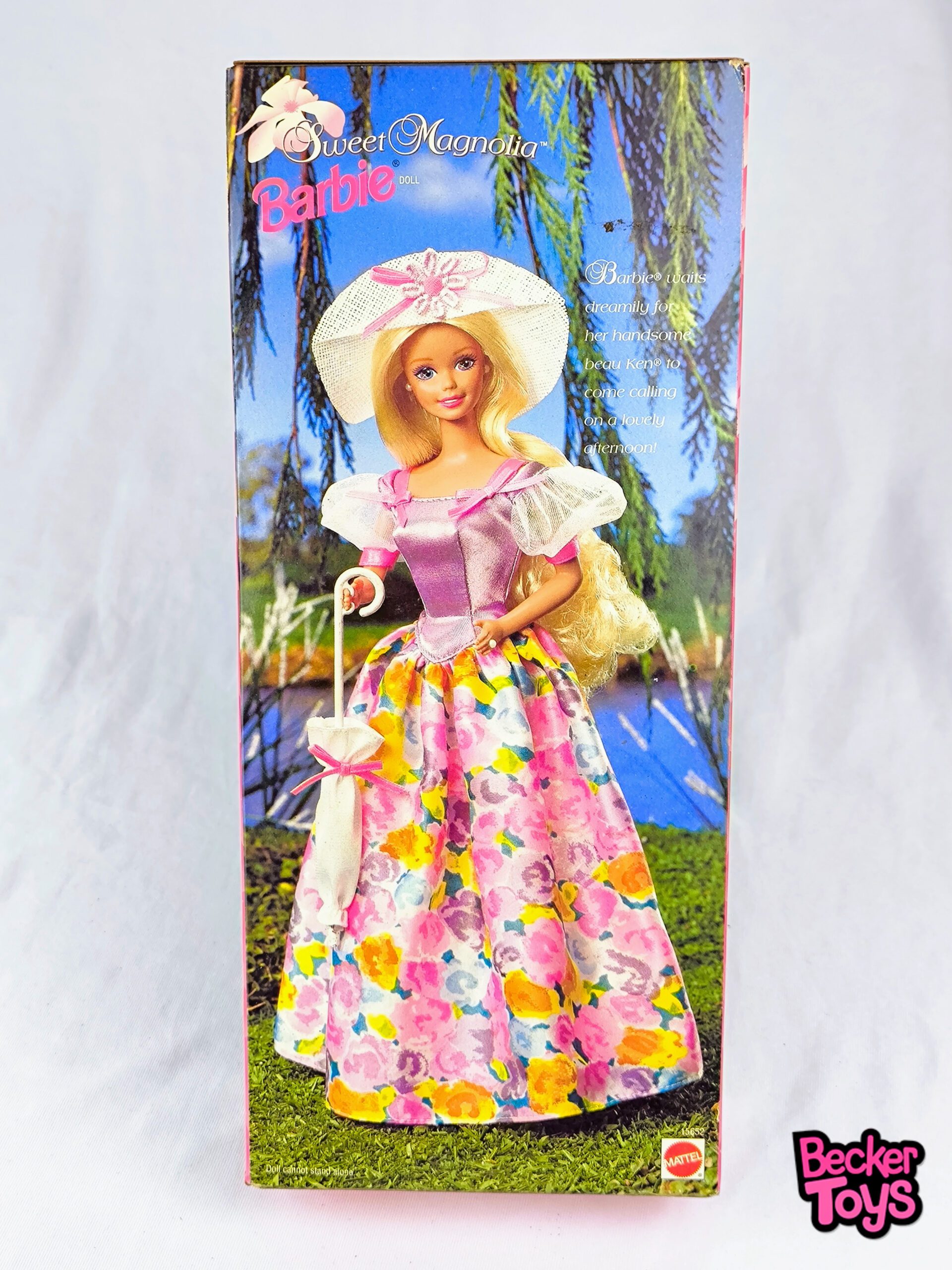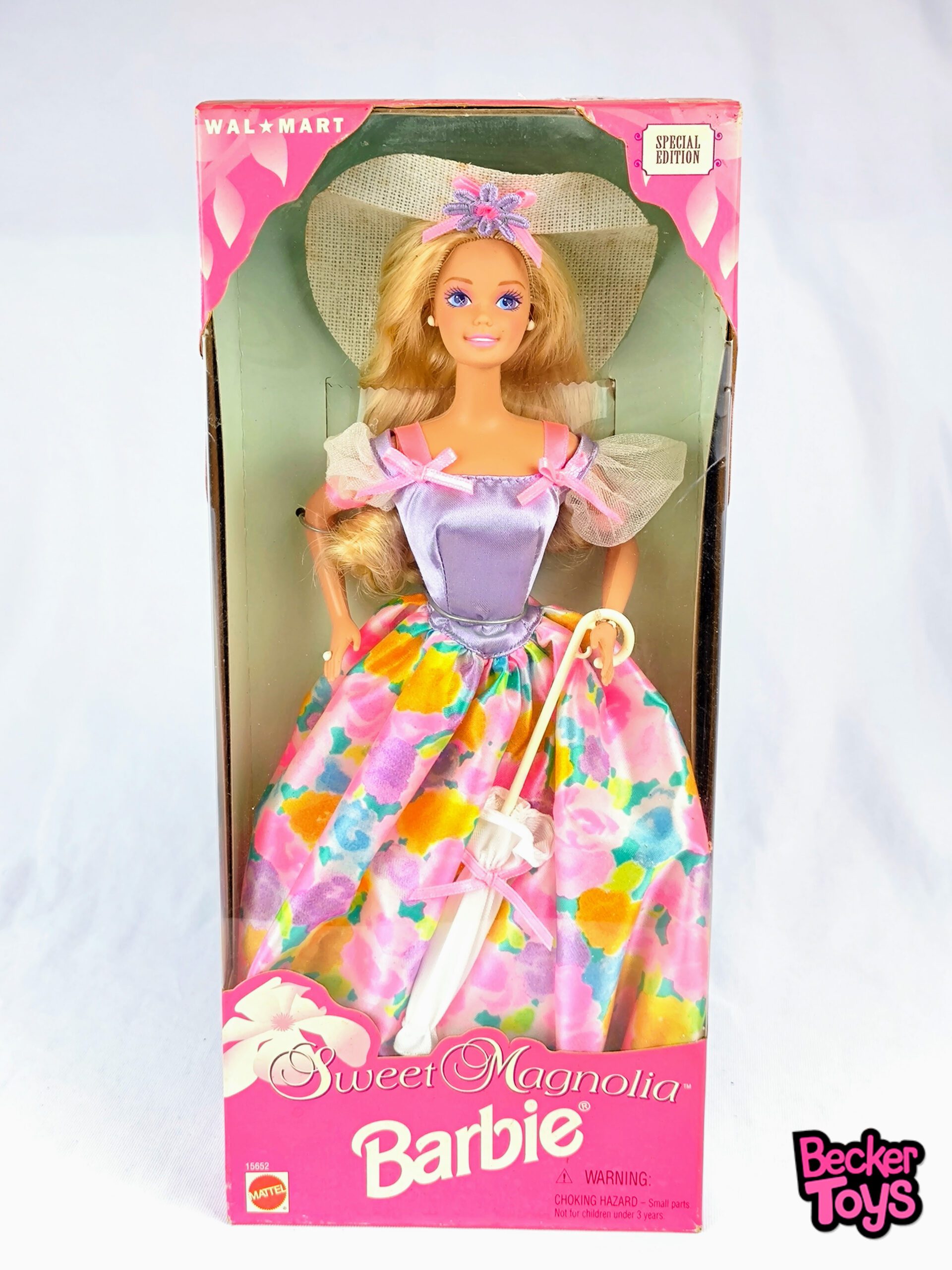 La Barbie Sweet Magnolia es una edición especial de Walmart con el número de modelo 15652. Esta encantadora muñeca luce un vestido floral que fluye elegantemente bajo un cuerpo ajustado de color lavanda. Viene completa con un sombrero blanco de ala ancha y una sombrilla blanca, accesorios perfectos para un paseo sureño por un jardín de magnolias.