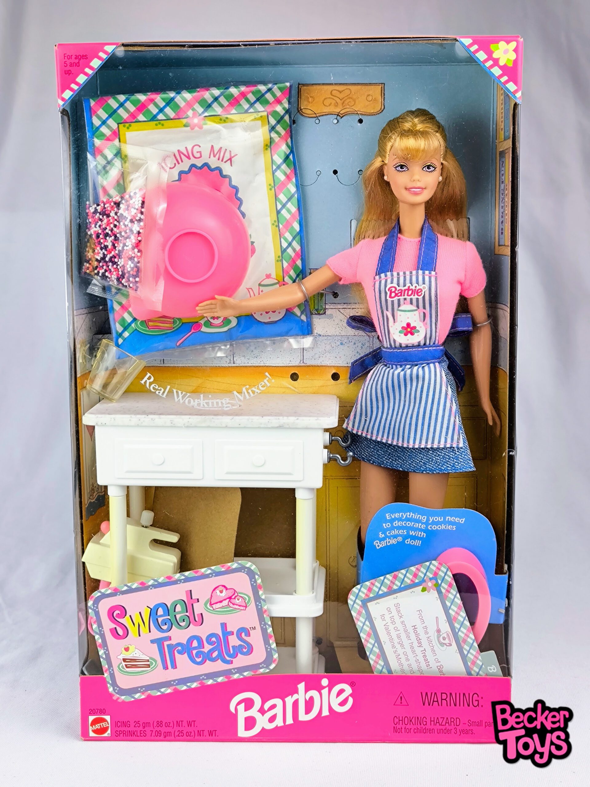 La Barbie Sweet Treats de 1998 es una edición especial que celebra la diversión de la cocina. Esta muñeca Barbie viene vestida con un atuendo de cocina que incluye un delantal y un vestido a cuadros. Además, el set incluye varios accesorios de cocina como una batidora, un bol, una mesa y utensilios de cocina.