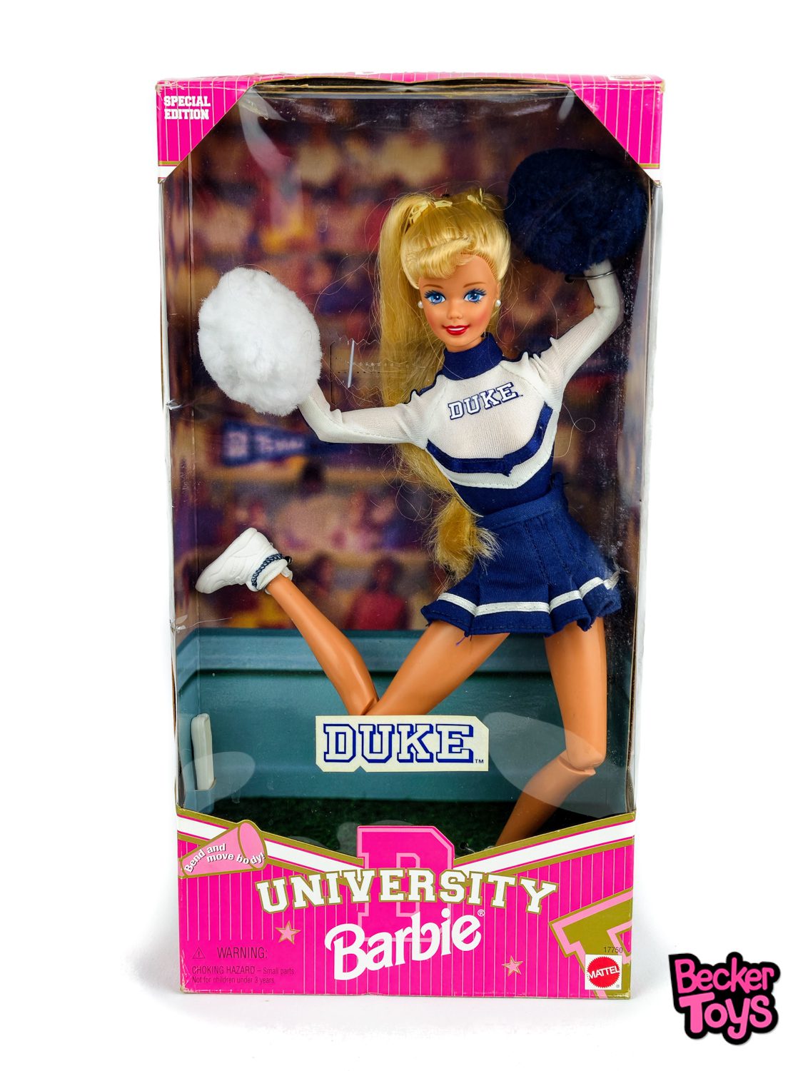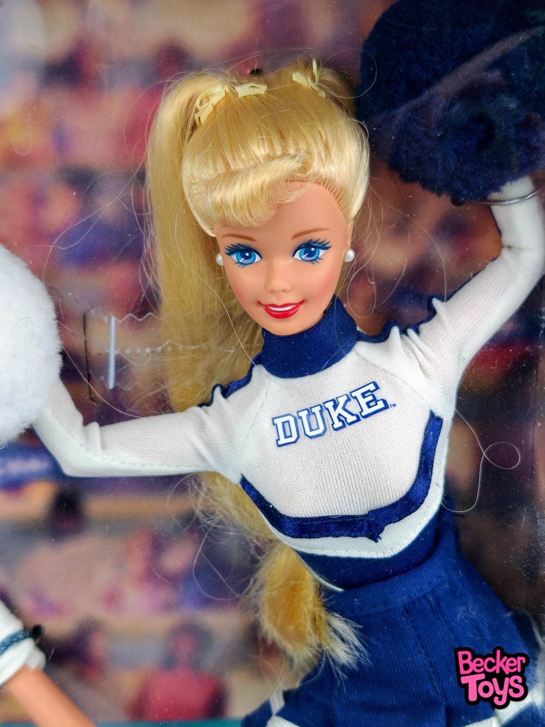 Esta edición especial de Barbie está inspirada en el equipo de animadoras de la Universidad de Duke. La muñeca está vestida con un atuendo de animadora con los colores icónicos azul y blanco de los Duke Blue Devils, y viene con pompones, completando su look de animadora universitaria.