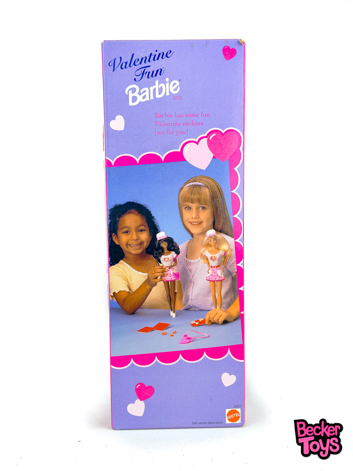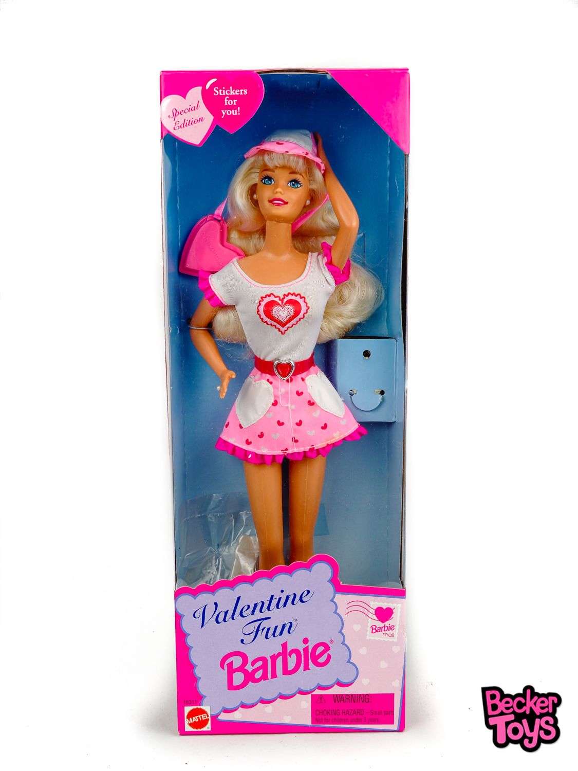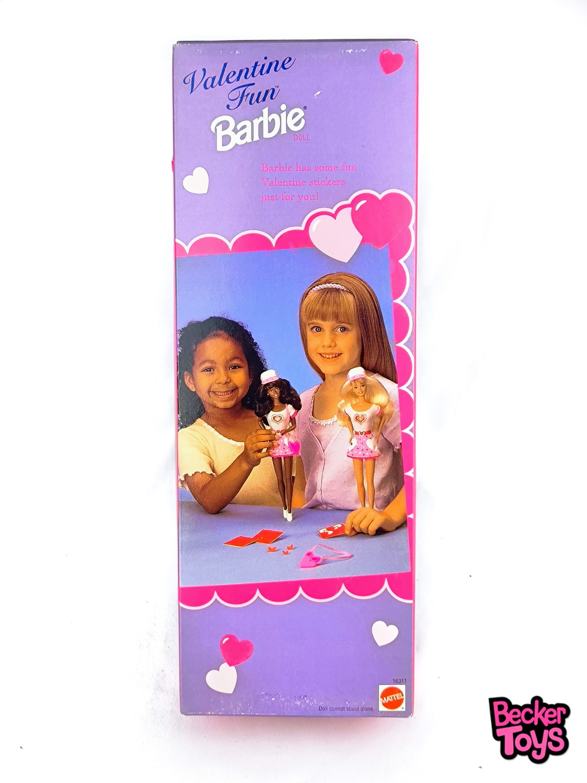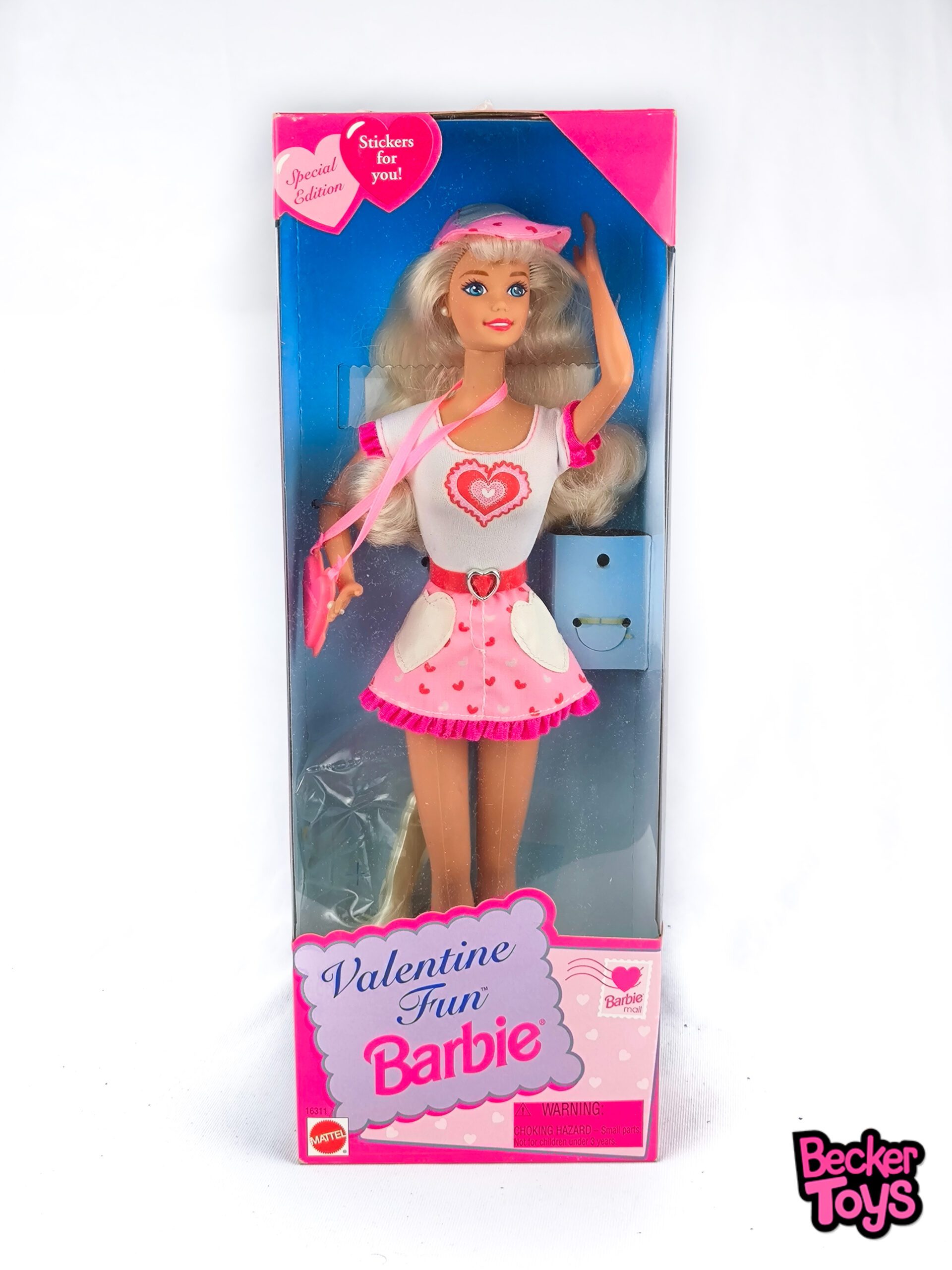 La Barbie Valentine Fun de 1996 es una edición especial de Mattel que celebra el Día de San Valentín. Esta muñeca Barbie viene vestida con una falda rosa adornada con un patrón de corazones y un sombrero a juego. Además, lleva un bolso en forma de corazón y viene con una hoja de pegatinas.