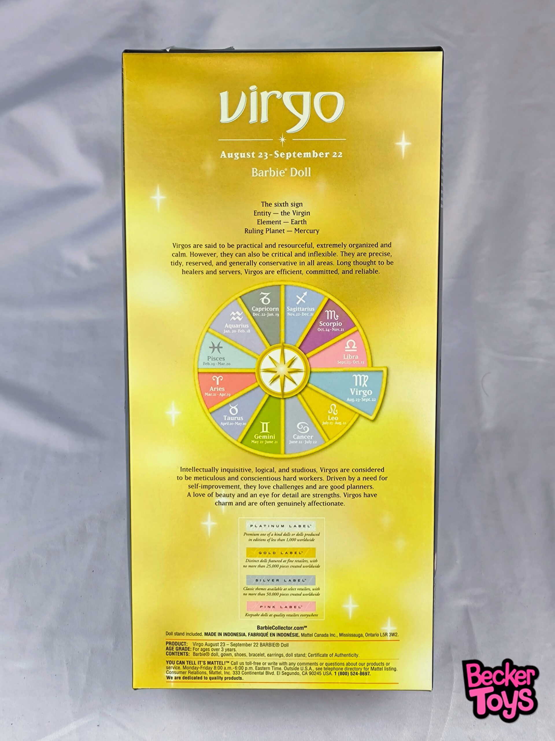 Barbie Virgo fue lanzada en 2004 dentro de la serie Zodiac Collection, una línea de doce muñecas que representaban cada signo del zodiaco con un estilo glamuroso y distintivo. Esta edición corresponde a Virgo (23 de agosto – 22 de septiembre), signo asociado con la elegancia, la discreción y la atención al detalle.