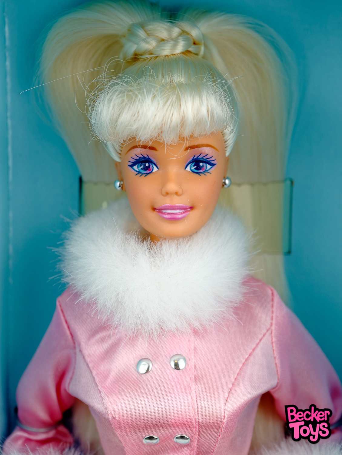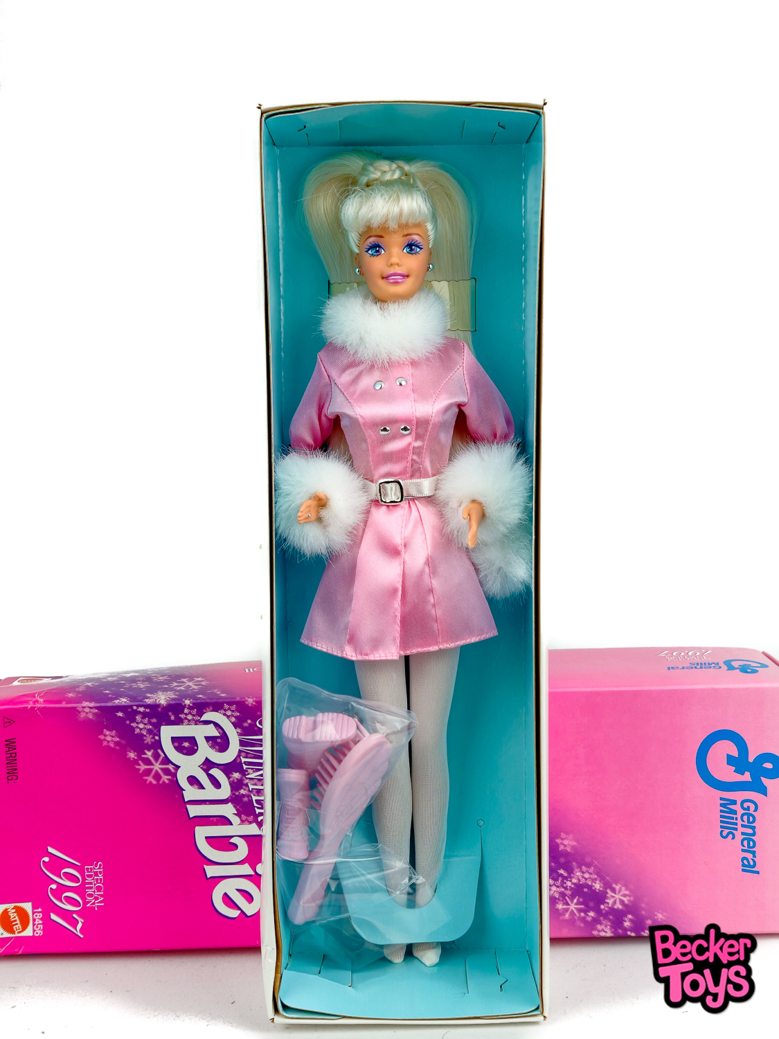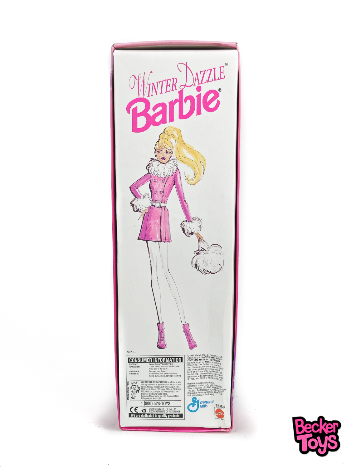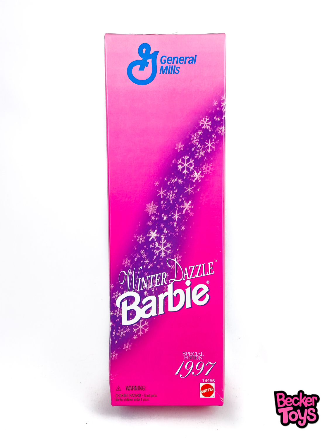 Barbie Winter Dazzle Special Edition 1997 con caja original. Edición especial exclusiva de General Mills. La muñeca presenta un conjunto invernal en color rosa satinado, con cuello y puños de efecto pelo blanco, cinturón claro en la cintura y medias blancas. Lleva el cabello rubio claro recogido en dos coletas altas con flequillo y pendientes visibles.