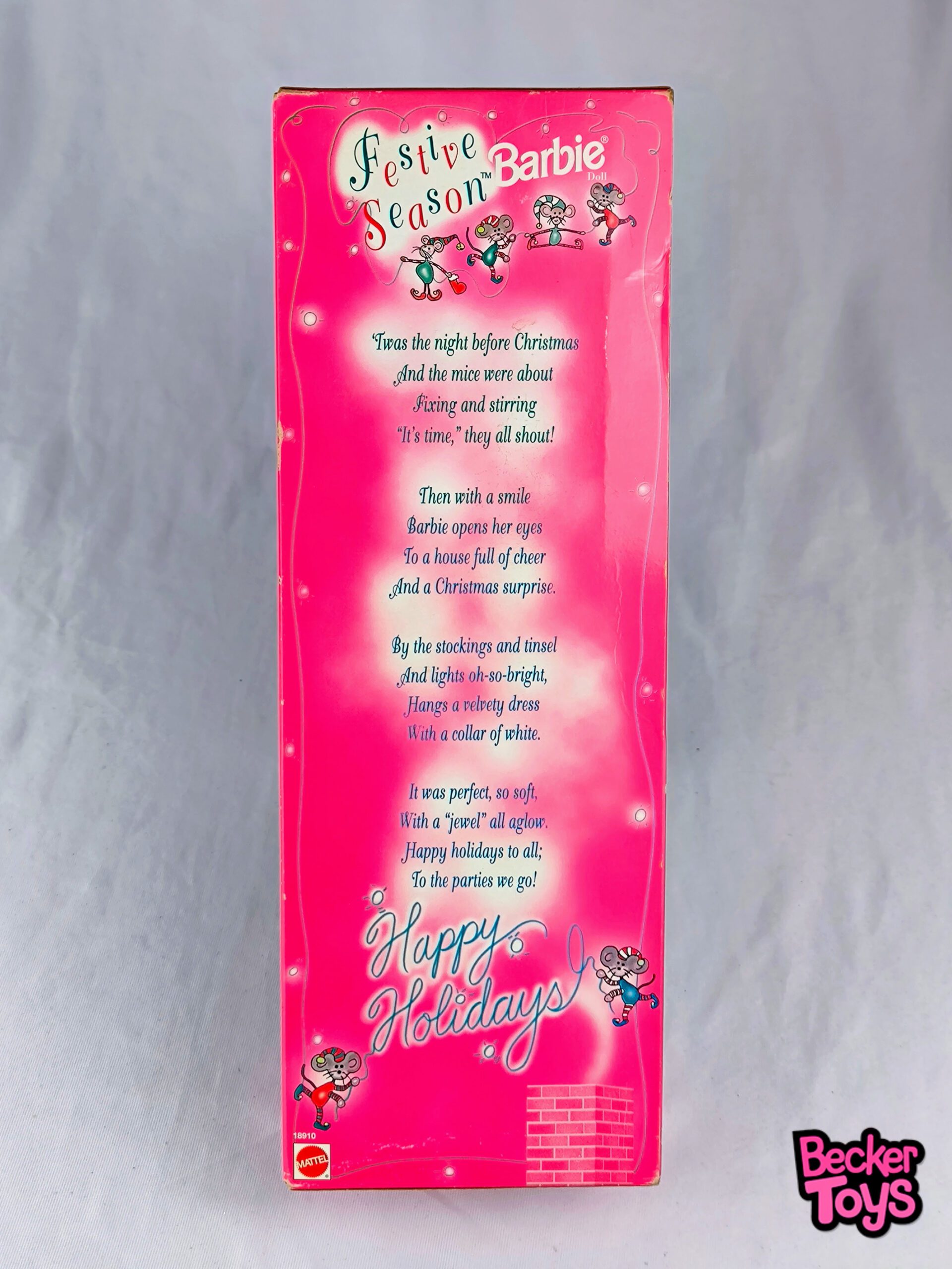 El fondo muestra una escena navideña con gráficos de ratones bailarines, bastones de caramelo y estrellas, en tonos rosados y verdes. En la parte frontal se lee “Festive Season Barbie – Special Edition”. El diseño está pensado para regalo y exhibición, con ventana amplia y estética navideña.