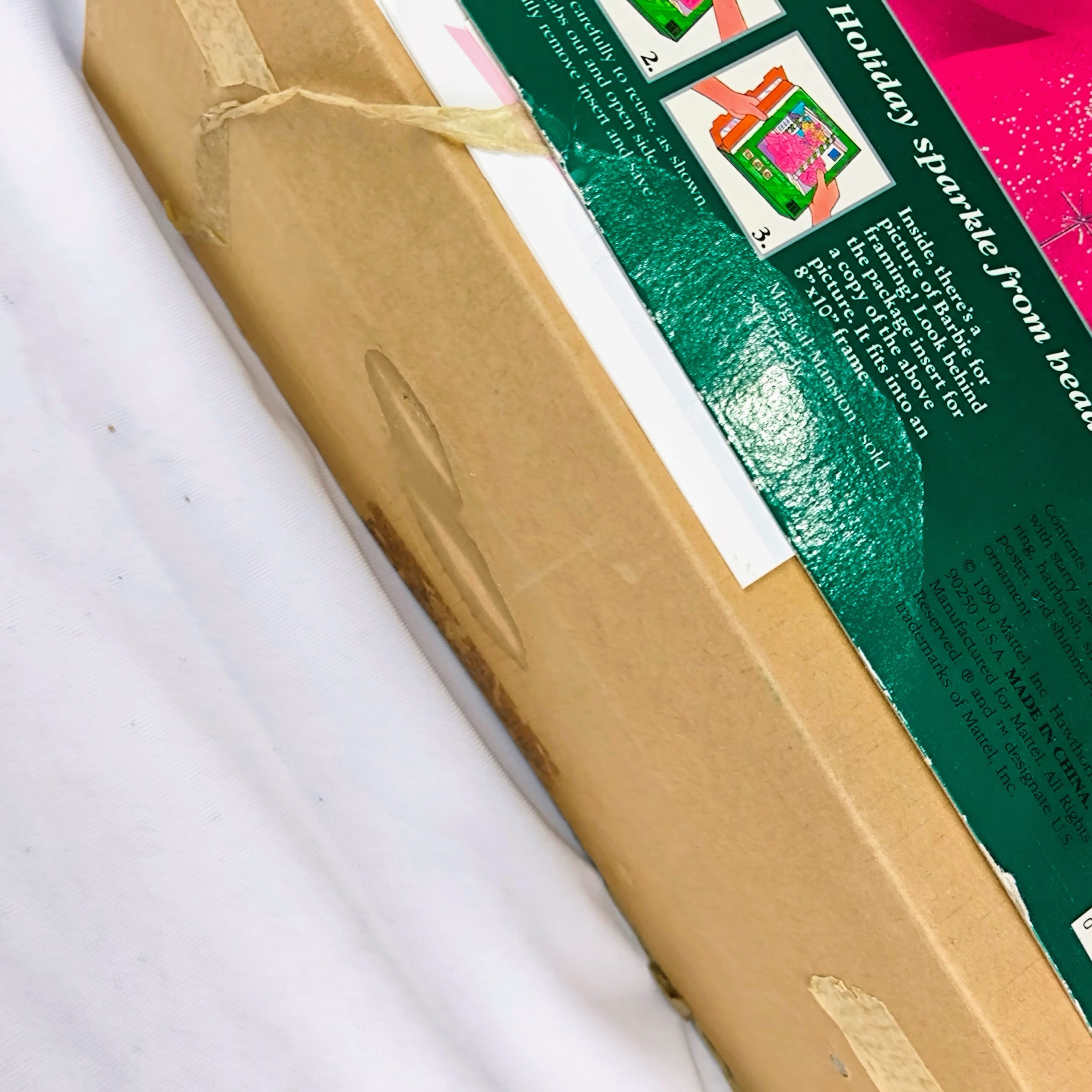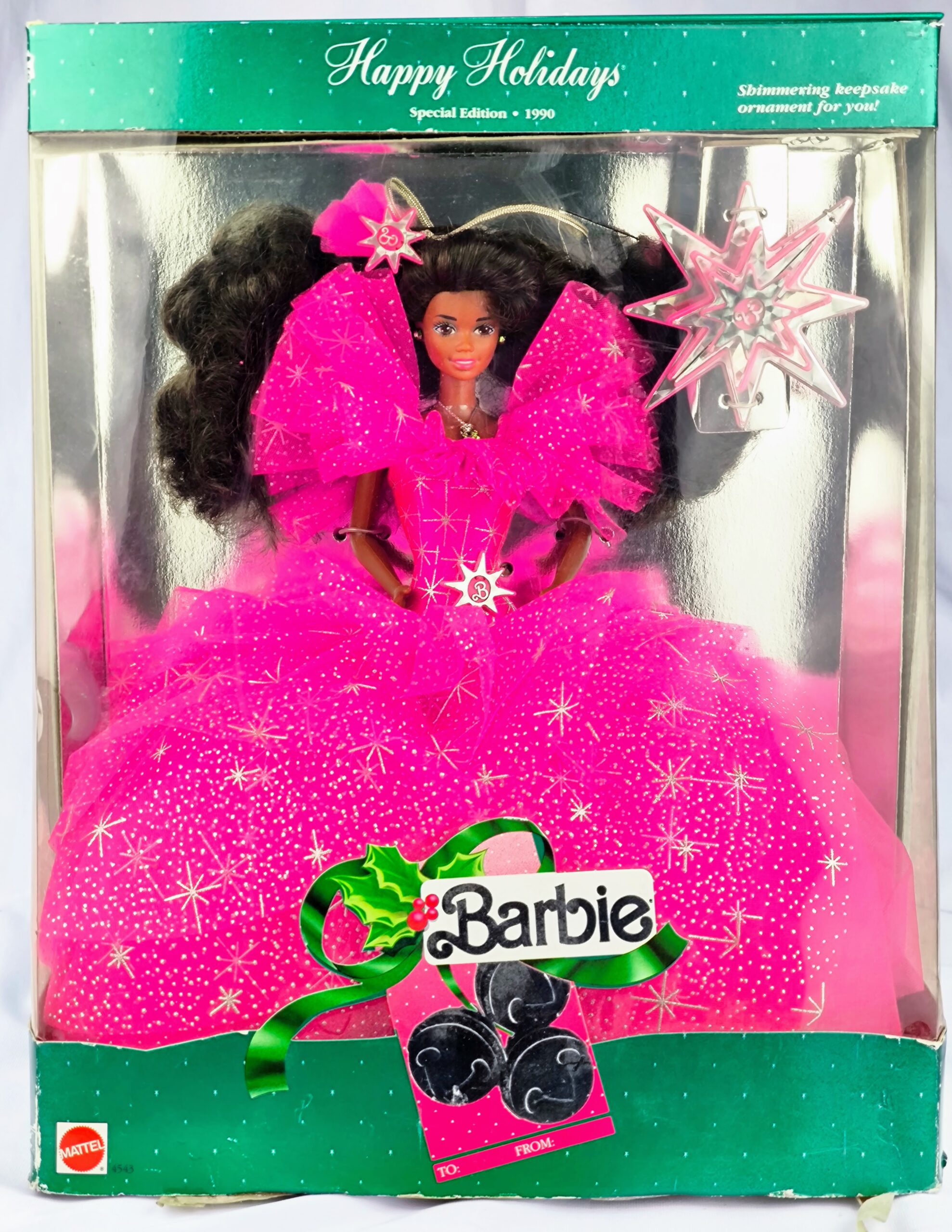 La caja original de la muñeca tiene un diseño festivo con un fondo verde y detalles en blanco. En la parte superior, se puede leer «Happy Holidays» en letras cursivas blancas, seguido de «Special Edition – 1990». Además, la caja incluye una estrella decorativa en la parte superior derecha y una etiqueta de regalo en la parte inferior con el logo de Barbie adornado con un lazo verde y hojas de acebo.