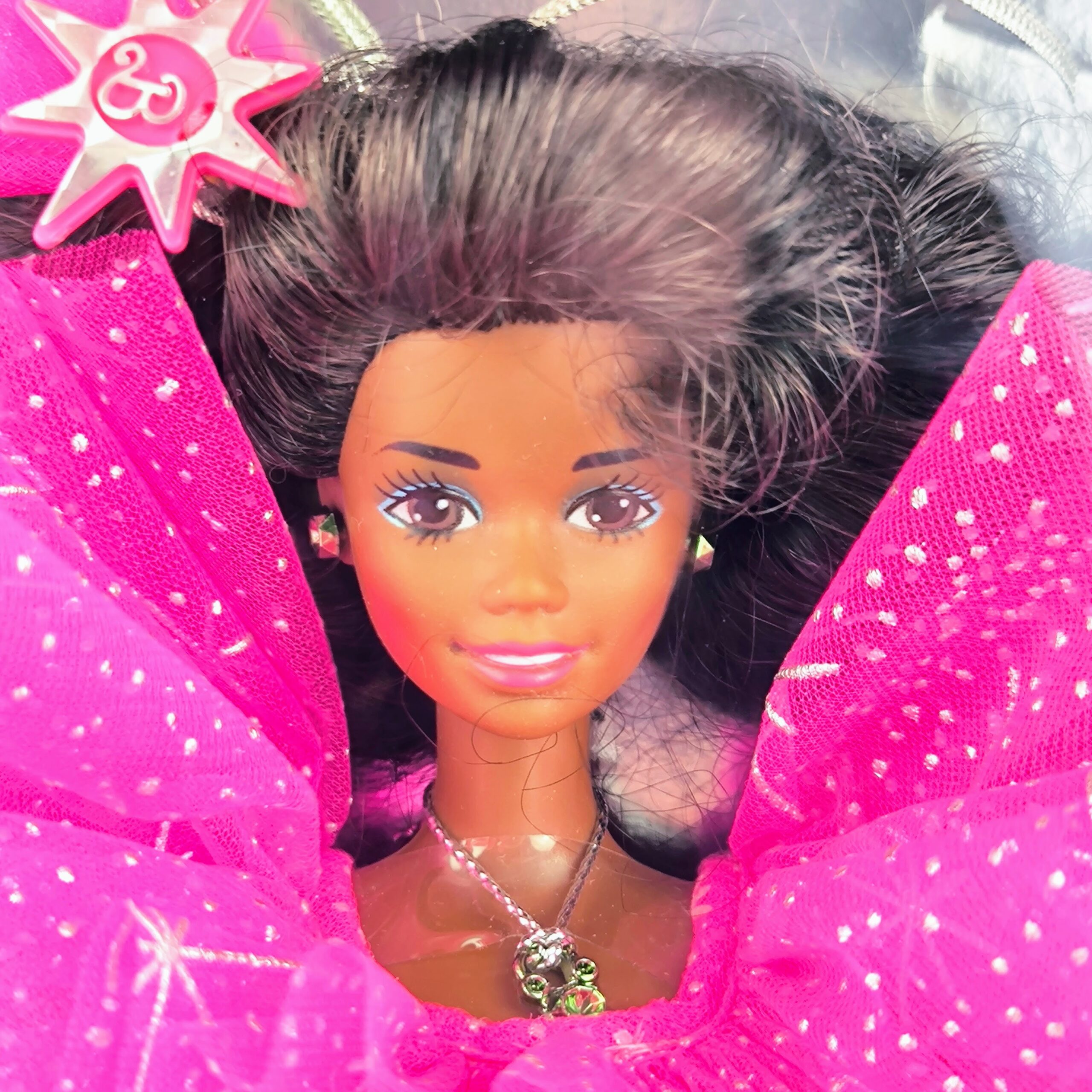Barbie AA Happy Holidays de 1990 es una edición especial de Barbie lanzada para las festividades. Esta muñeca luce un elegante vestido largo y voluminoso de color rosa brillante, adornado con detalles de estrellas blancas. Lleva un gran lazo rosa en el pecho y otro en su cabello, lo que le da un toque festivo y encantador.