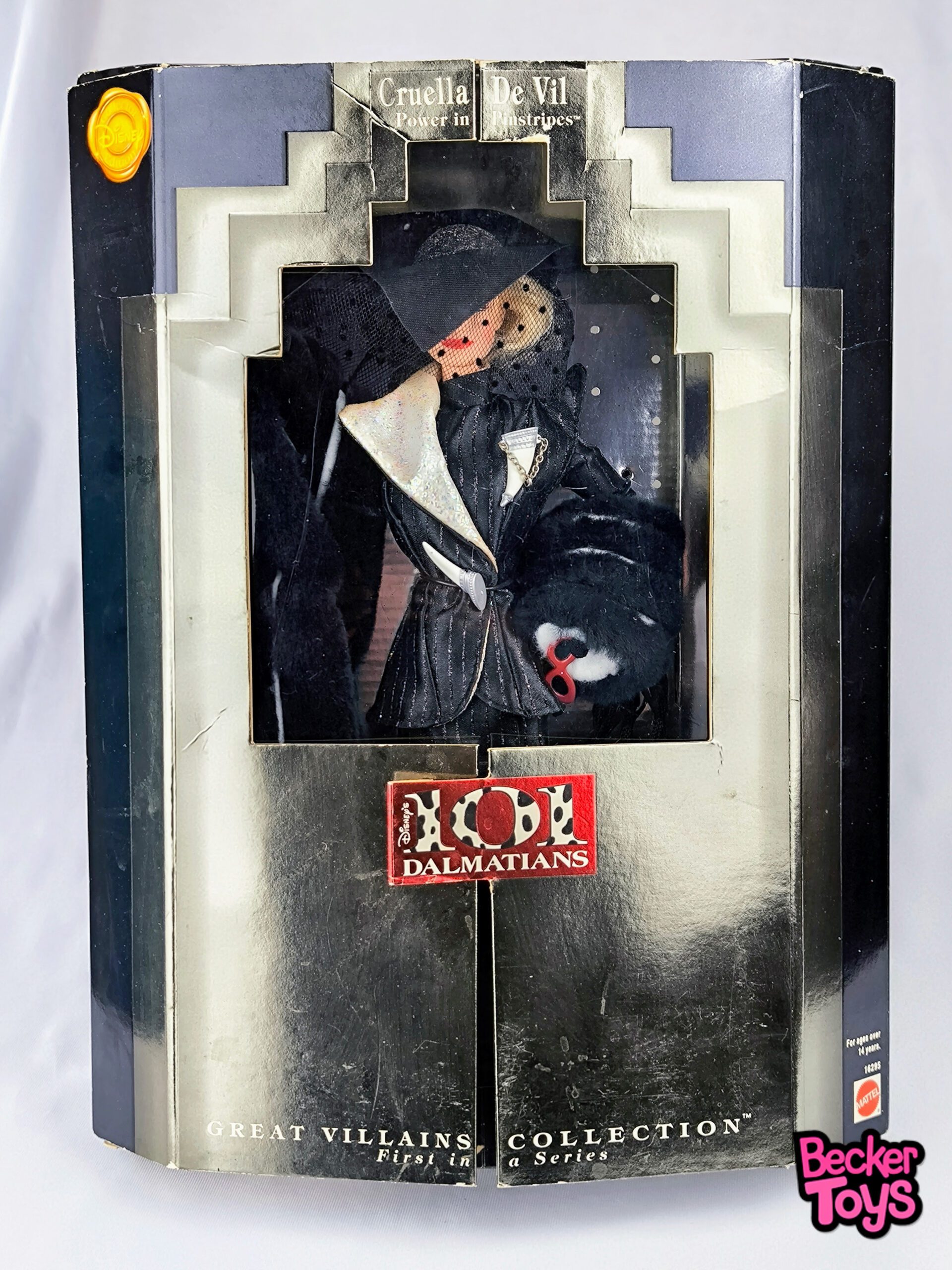 Muñeca de colección Great Villains – Disney 101 Dálmatas, Cruella De Vil Power In Pinstripes de 1996. Nueva. Nunca sacada de la caja. Caja dañada. Le falta el cigarrillo con su filtro.