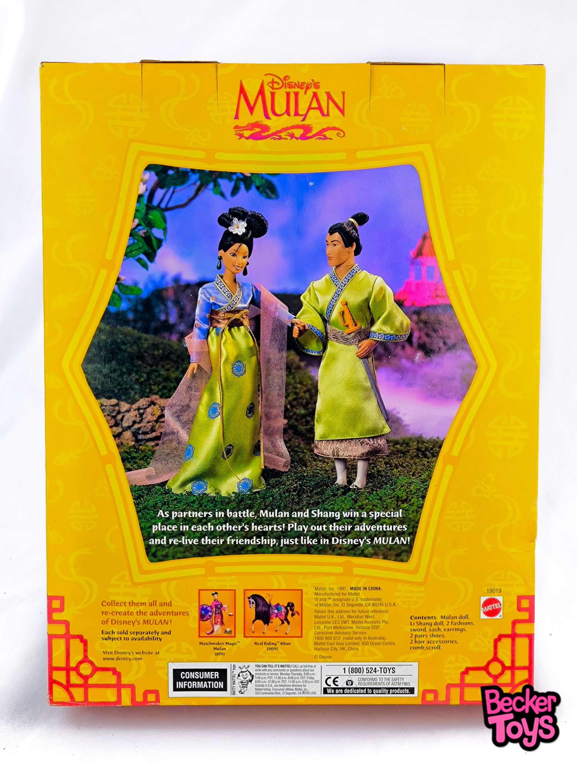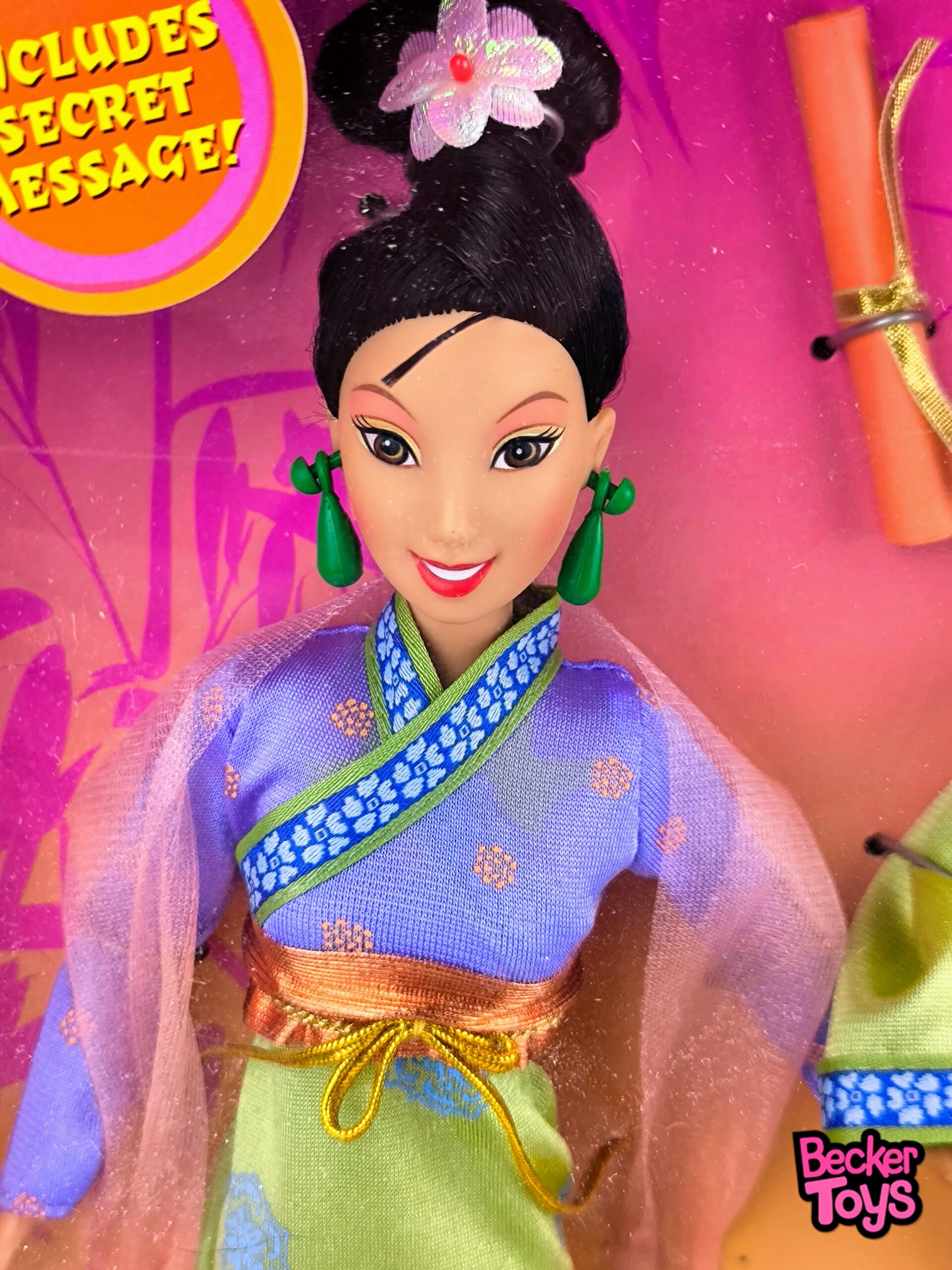 🏮 Disney’s Mulan & Shang – Hearts of Honor (1997) – Mattel #19019 – Collector Gift Set Esta edición especial de 1997 celebra la conexión entre Mulan y el Capitán Li Shang, inspirada en la película animada de Disney Mulan. Hearts of Honor es un set conmemorativo que destaca el vínculo entre ambos personajes como compañeros de batalla y figuras de respeto mutuo, ideal para coleccionistas de muñecas Disney y fans del film.