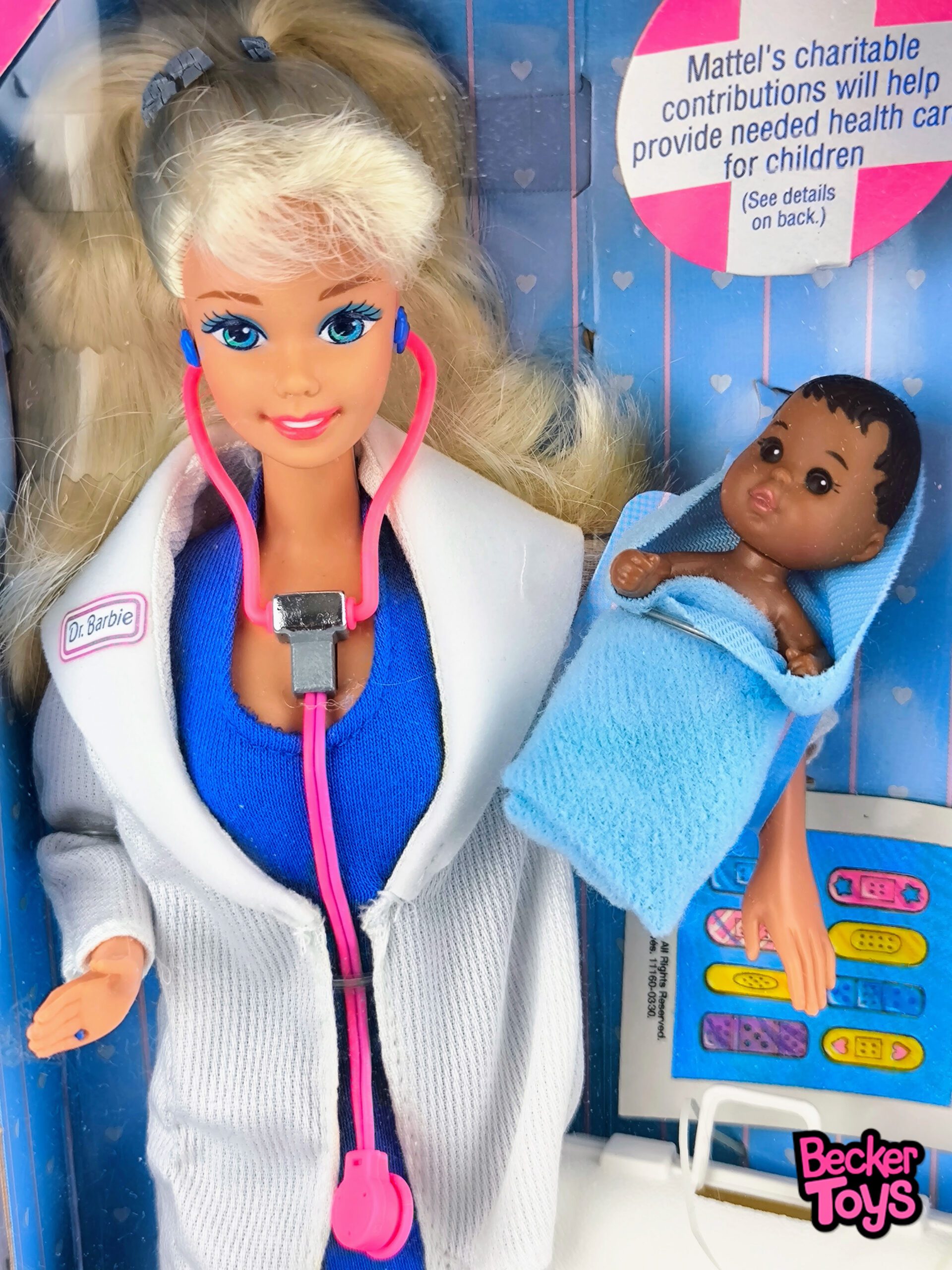 La Dr. Barbie de 1993 es una muñeca clásica que representa a Barbie como una doctora. Esta edición especial incluye un estetoscopio mágico que, al colocarlo sobre el bebé o cualquier paciente, permite escuchar los latidos del corazón. Además, viene con vendas adhesivas divertidas para curar al bebé y otros accesorios de juego.