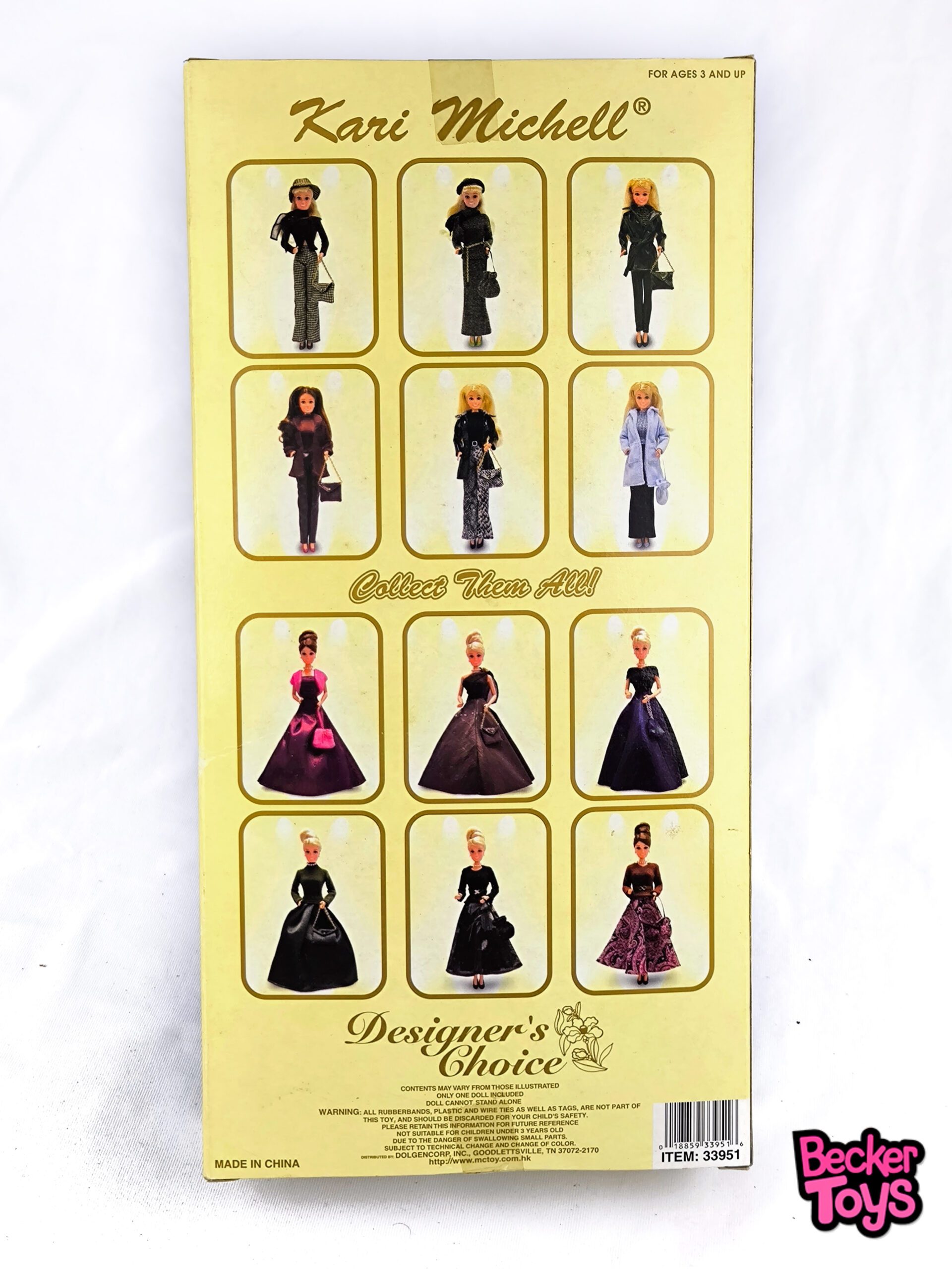 Kari Michell Designer’s Choice es una línea de muñecas de moda de los años 90, fabricada por M&C y distribuida por DollGenie Inc., que ofrecía alternativas coleccionables y asequibles al estilo Barbie, con variedad de atuendos y accesorios. El modelo #33951 es uno de los más buscados por coleccionistas vintage.