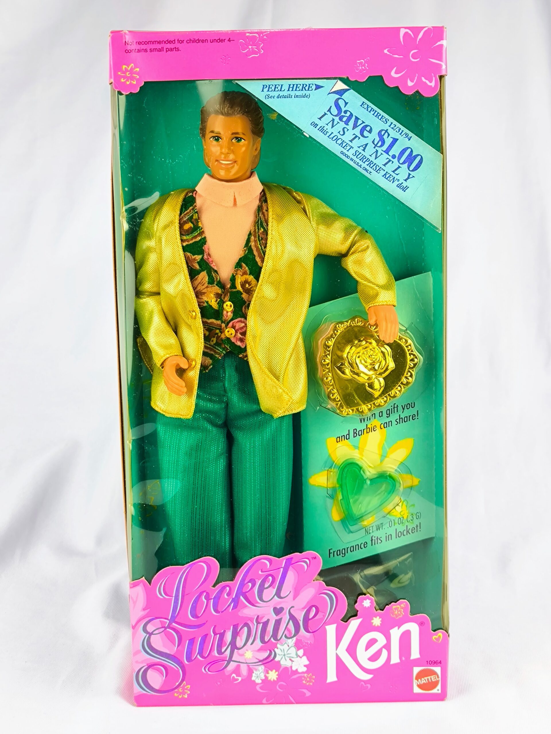 Muñeco de colección Ken Locket Surprise de 1993. Nuevo, nunca sacado de la caja. Caja dañada con plástico amarillento.