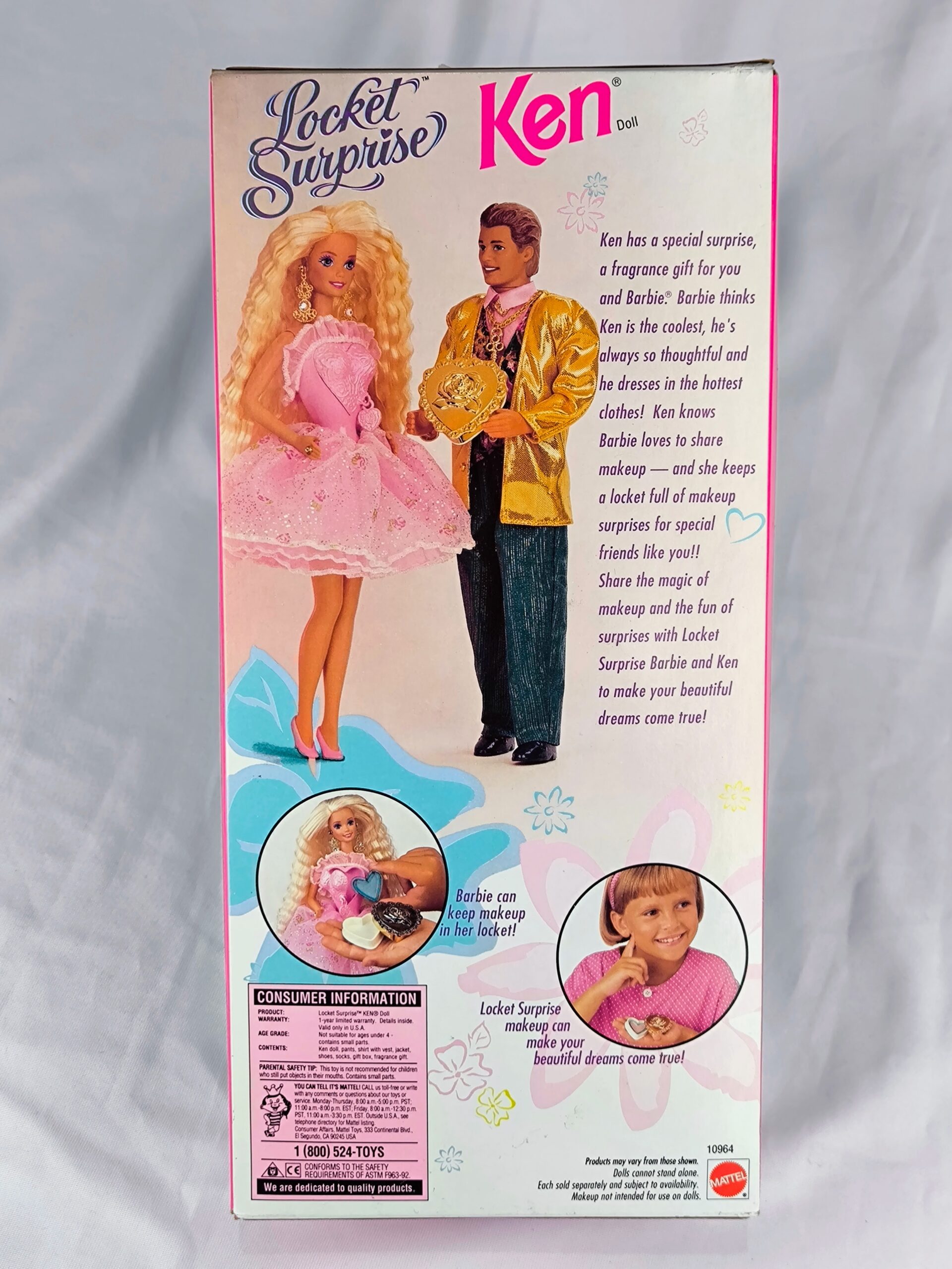 Ken Locket Surprise de 1993 es una figura especial producida por Mattel. Viene vestido con un traje elegante y moderno de principios de los 90, con detalles que capturan la moda de esa época. Lo que distingue a esta figura es el «locket» (medallón) que Ken lleva consigo, que añade un toque sorpresa y misterio a este producto. Este Ken de cabello castaño y ojos azules está listo para cualquier evento formal o cita elegante, haciendo de él una pieza muy querida por los coleccionistas.