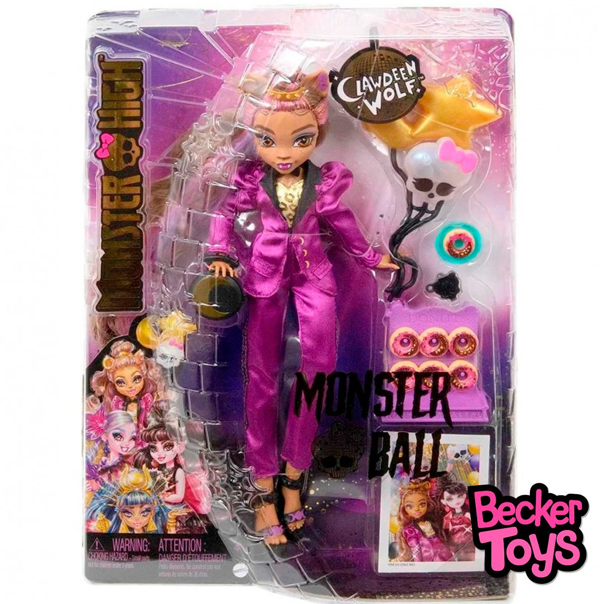 ¡La muñeca Clawdeen Wolf llega al Monster Ball con un estilo garrafalmente genial! Este traje elegante y misterioso de mujer lobo brilla tanto como la luna llena. Su cabello brillante se acentúa con un moño en la parte superior, mientras que unos aretes desiguales, una gargantilla negra y unos tacones de plataforma completan su look. Las accesorios adicionales ayudan a crear una fantástica velada.