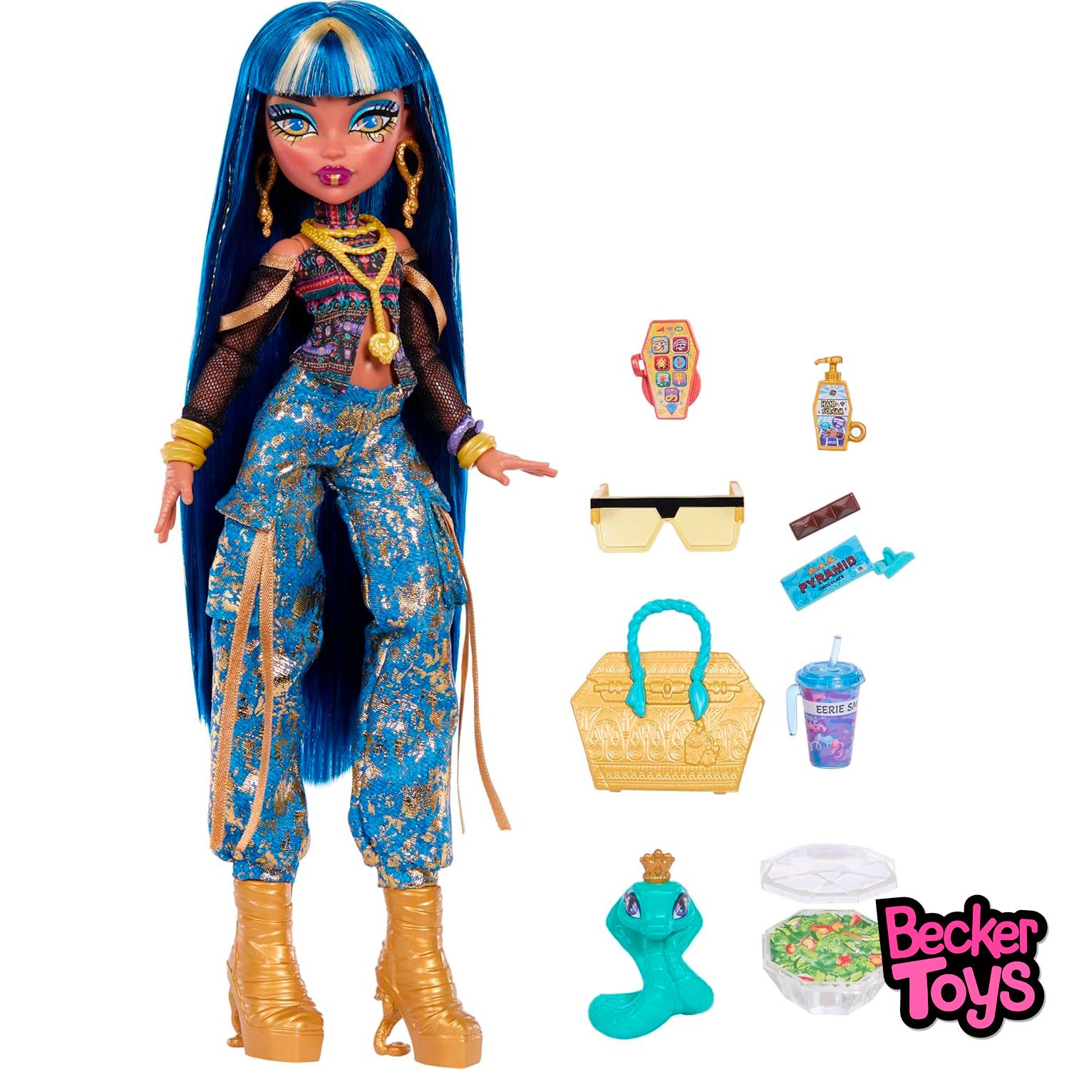 - ¡Cleo de Nile está monstruosamente majestuosa! Con su mascota cobra Hissette y sus 7 accesorios, está lista para convertirse en la reina de los alumnos de Monster High sin dejar de derrochar estilo.