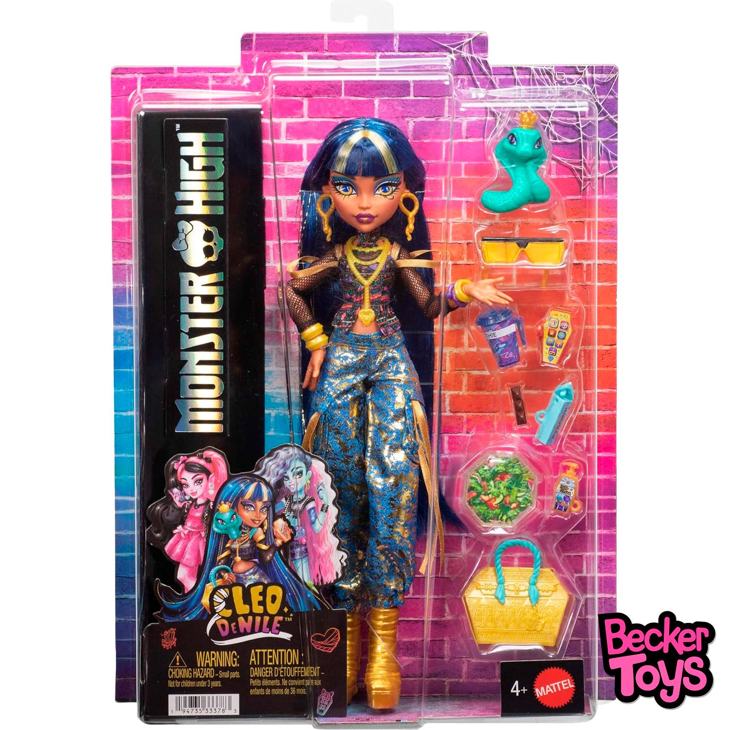 - ¡Cleo de Nile está monstruosamente majestuosa! Con su mascota cobra Hissette y sus 7 accesorios, está lista para convertirse en la reina de los alumnos de Monster High sin dejar de derrochar estilo.