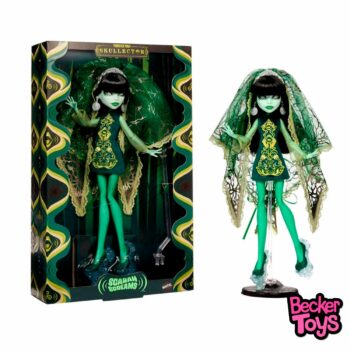 Una de las ghouls más dulces de Monster High por fin recibe su propia muñeca Skullector exclusiva para miembros, lista para hacerte gritar. Scarah Screams es una hermosa banshee con un estilo fabooloso de los años 60. Está vestida con un look verde gore-geous inspirado en su “scare‑itage” de la Isla Esmeralda, que incluye un minivestido con tacto aterciopelado y bordados psyche‑Celtic. Lleva además un sudario sobrenatural que representa el bosque de su tierra natal, medias verdes transparentes y delicados zapatos de estilo mid‑century que se transforman en tacones encantados.