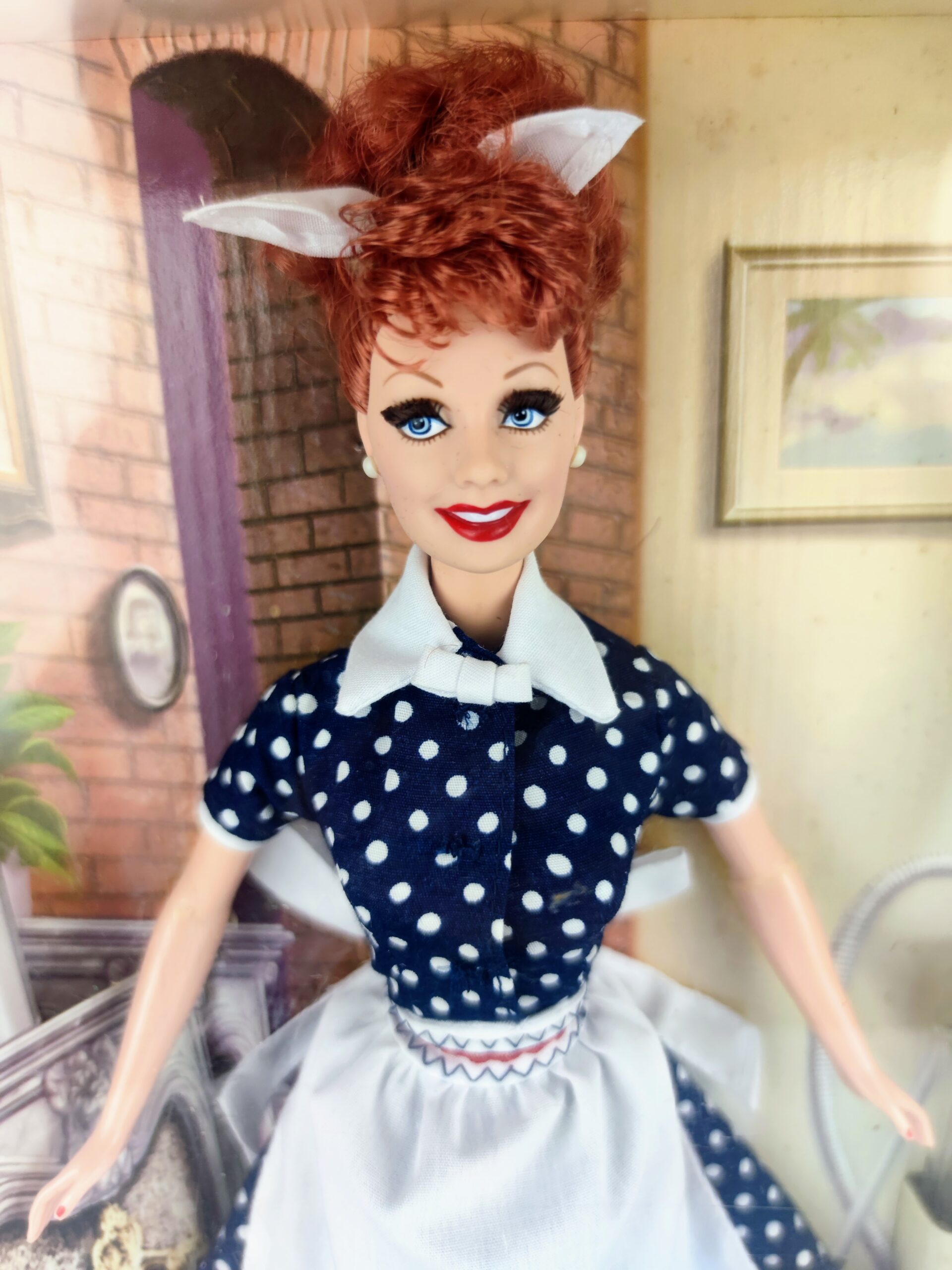 La muñeca mide aproximadamente 29,2 cm de altura y representa a Lucille Ball como Lucy Ricardo. Lucy está vestida con su famosa falda azul con puntos blancos y un delantal blanco con trim rojo. Su cabello es rojo y está recogido con una banda blanca.