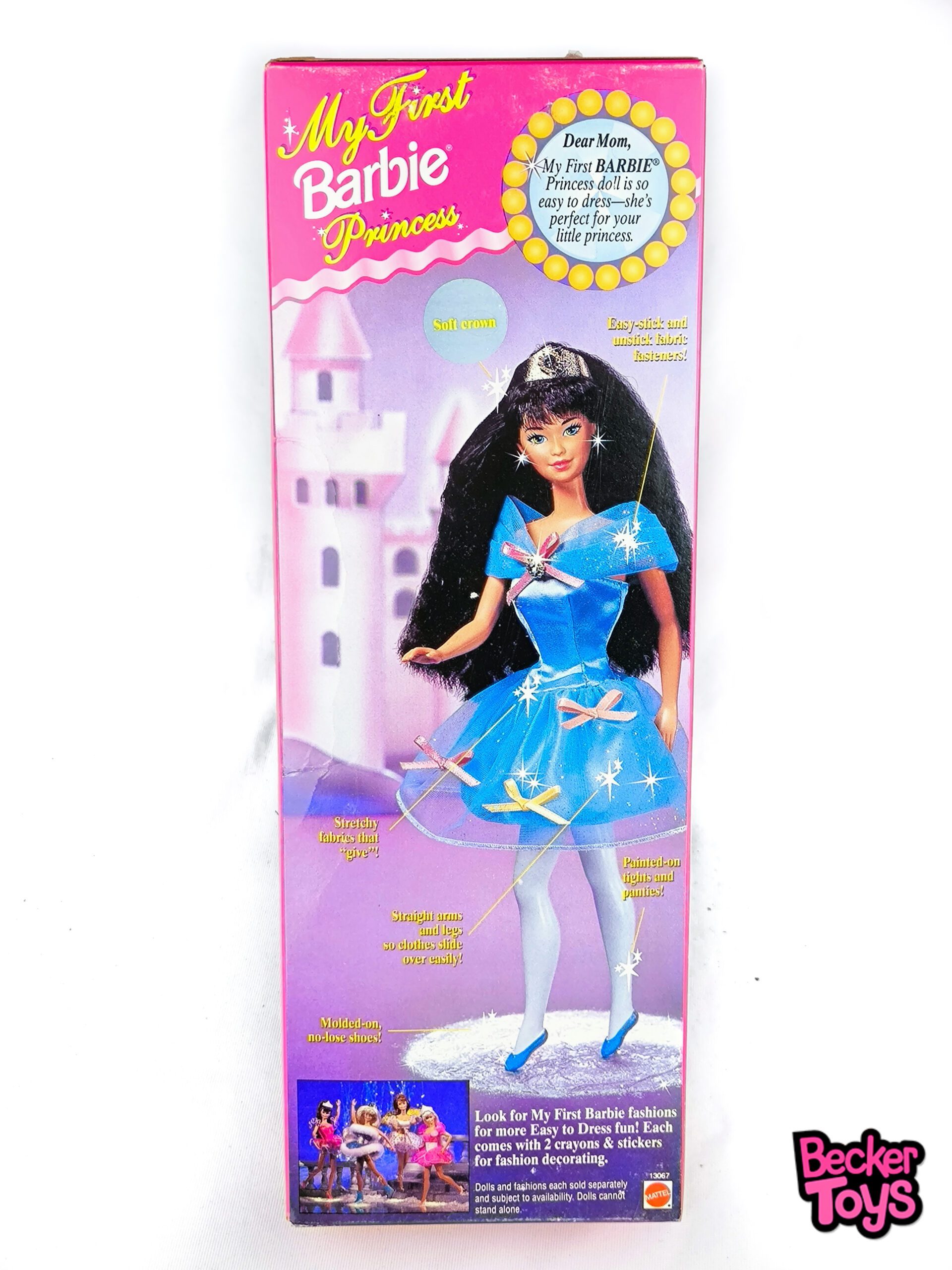 La caja presenta ilustraciones de castillos y mensajes dirigidos a madres, destacando la facilidad de uso y seguridad del producto. Como pieza NRFB, esta edición es especialmente valorada por coleccionistas que buscan diversidad en la línea Barbie, muñecas de iniciación o lanzamientos temáticos de princesas.
