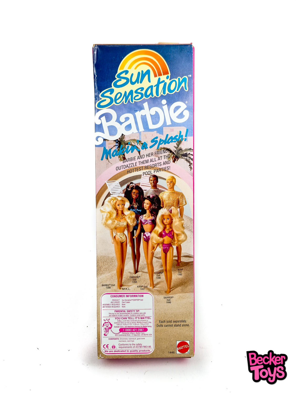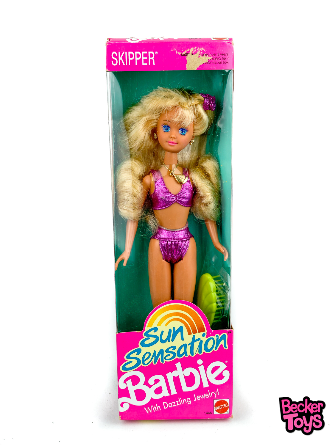 Skipper Sun Sensation de 1991 en su caja original. Muñeca vintage de la línea Sun Sensation Barbie, con bikini de dos piezas en color fucsia brillante y accesorios de bisutería. Presenta cabello rubio voluminoso con coleta lateral, pendientes, collar con colgante y accesorio visible en el interior de la caja.