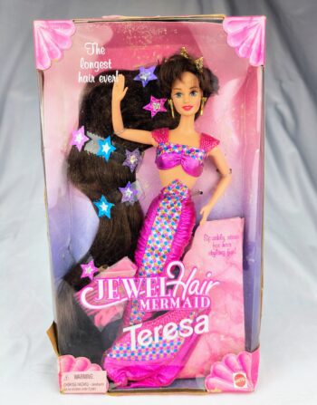 La Barbie Jewel Hair Mermaid Teresa de 1995 es una figura icónica de la colección Barbie. Esta versión de Teresa presenta a la famosa amiga de Barbie con un traje de sirena y cabello largo y brillante, lo que la convierte en una de las Barbie más recordadas y queridas por los coleccionistas.