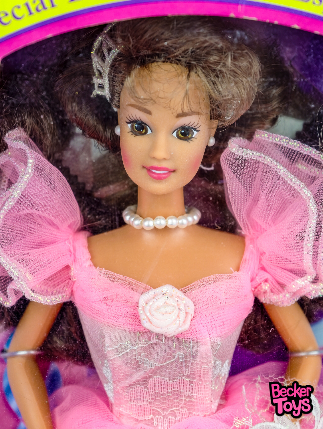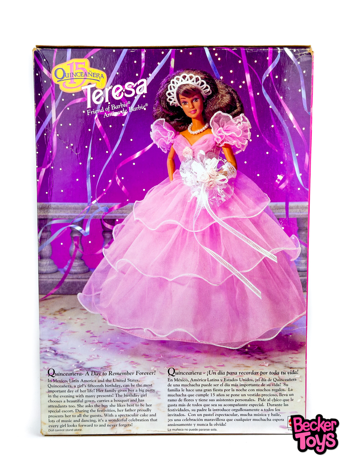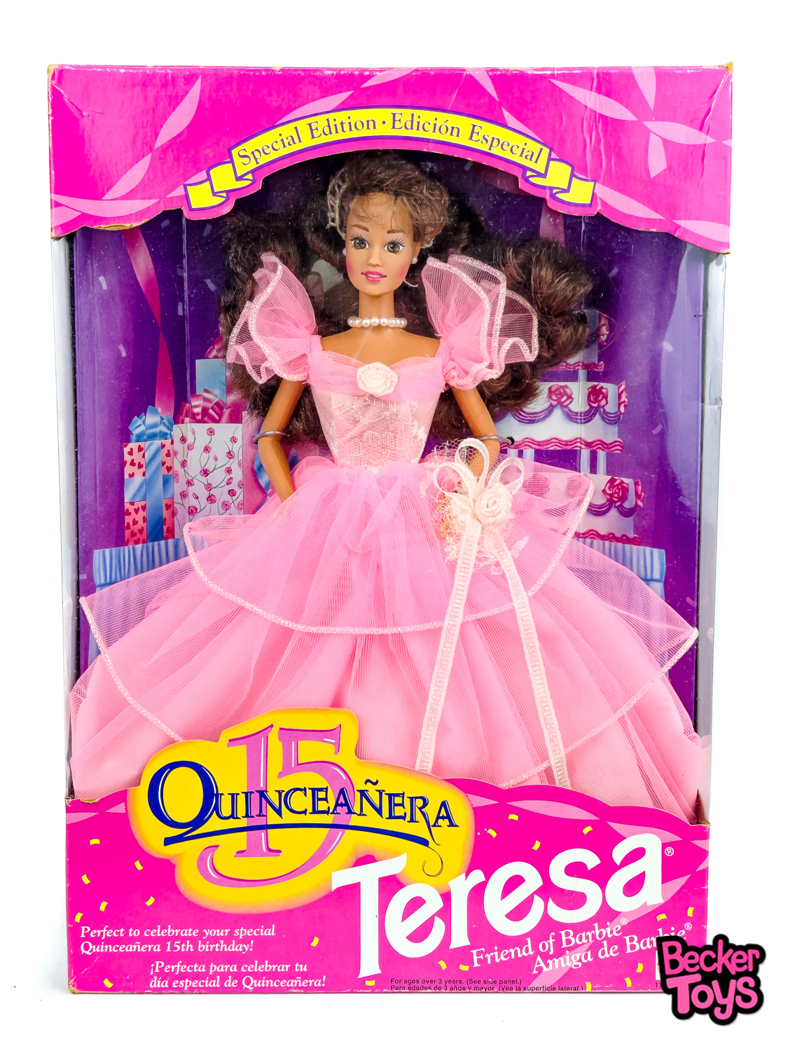 Teresa Quinceañera de 1994 en su caja original. Esta Special Edition está inspirada en la celebración de la quinceañera, una fiesta tradicional muy reconocida en México, América Latina y la comunidad latina en Estados Unidos para conmemorar los 15 años. La muñeca representa ese estilo festivo con un vestido amplio de color rosa y una presentación centrada en una ocasión especial.