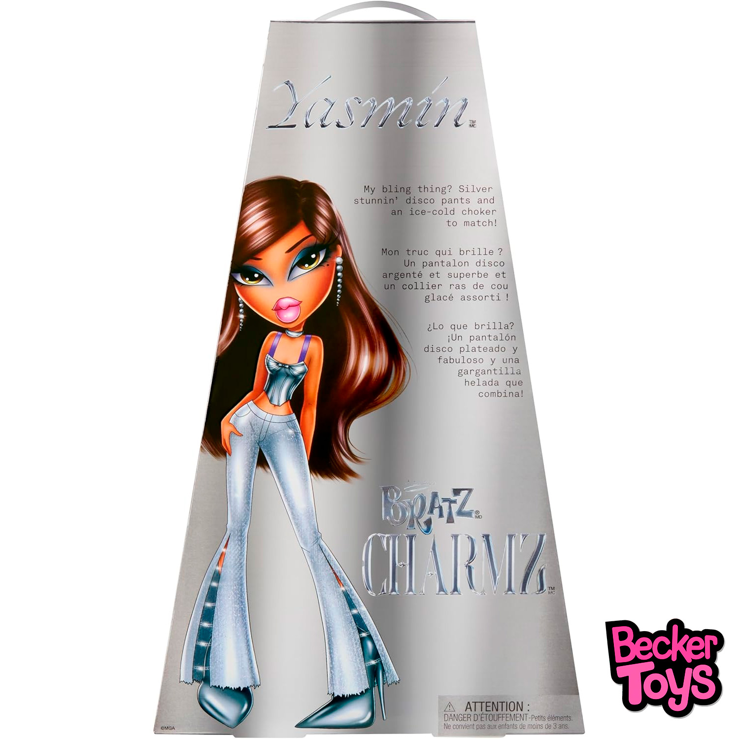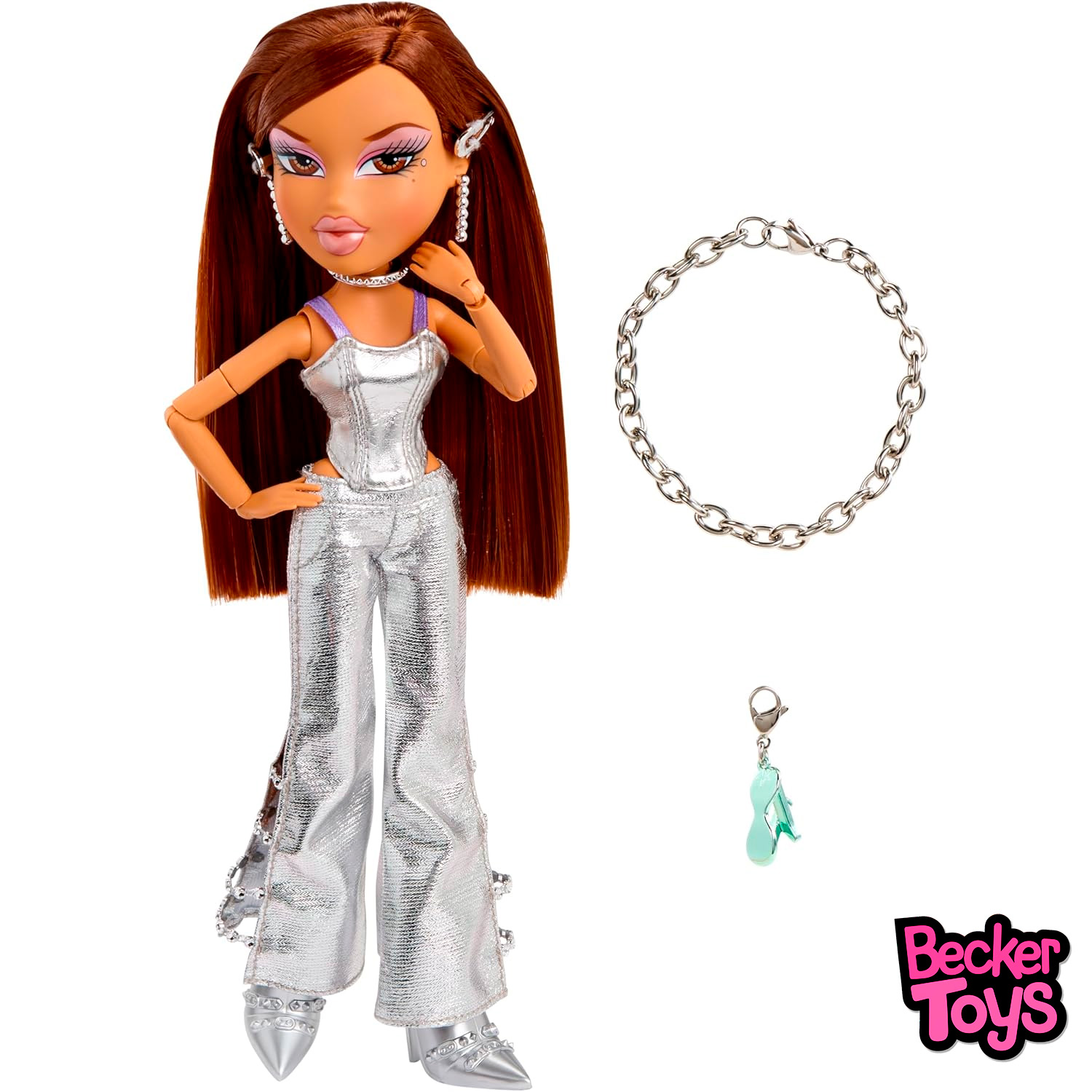 Bratz Charmz Yasmin es una muñeca con un look sofisticado, brillante y muy fiel al estilo más glam de Bratz. Esta versión de Yasmin destaca por su conjunto en acabado plateado metalizado, con una estética inspirada en la moda disco y en los accesorios tipo joya que definen la colección Charmz.