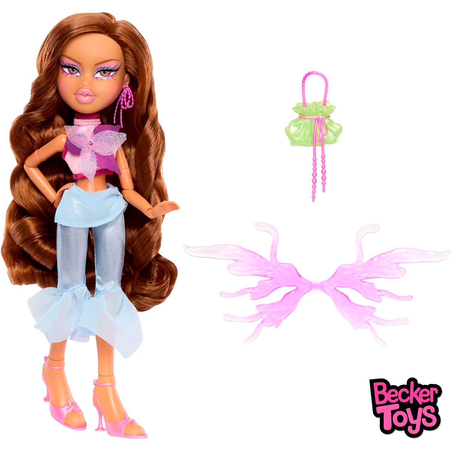 La muñeca luce una melena larga con ondas marcadas, maquillaje en tonos rosados y lilas, top brillante con detalle floral, pantalón de acabado satinado con volantes en el bajo y accesorios que completan una estética etérea pero muy Bratz. Las alas semitransparentes y el bolso en color verde translúcido refuerzan ese aire de fantasía moderna que hace que la pieza destaque tanto dentro como fuera de la caja.