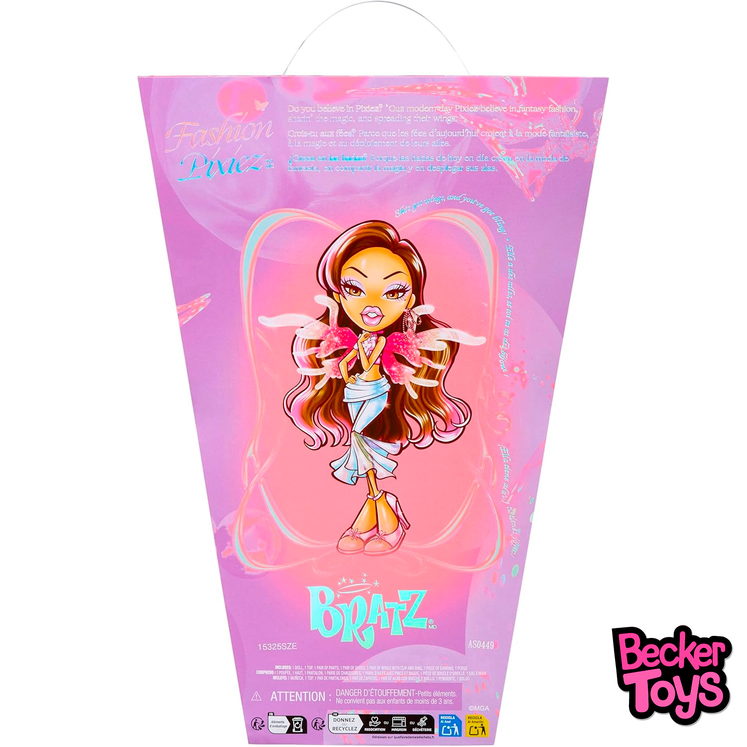 Bratz Fashion Pixiez Yasmin Reimagined reinventa una de las propuestas más mágicas del universo Bratz con una versión moderna, delicada y muy llamativa. Esta edición presenta a Yasmin con un look de hada fashion en tonos pastel, alas translúcidas y un conjunto de inspiración fantástica que mezcla brillo, suavidad y ese estilo atrevido tan característico de la marca.