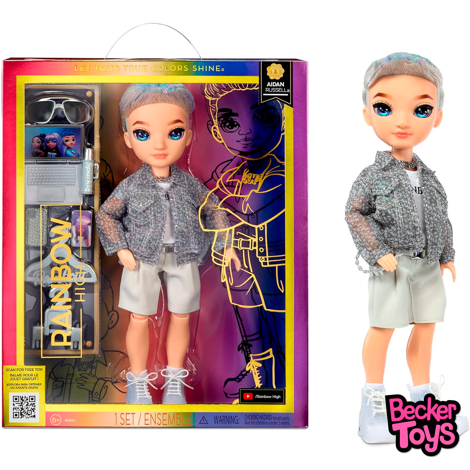 Rainbow High Aidan Russell es un muñeco de moda articulado de la Serie 5, con un look morado nacarado y más de 10 accesorios que lo convierten en una pieza imprescindible para coleccionistas y fans de la saga.