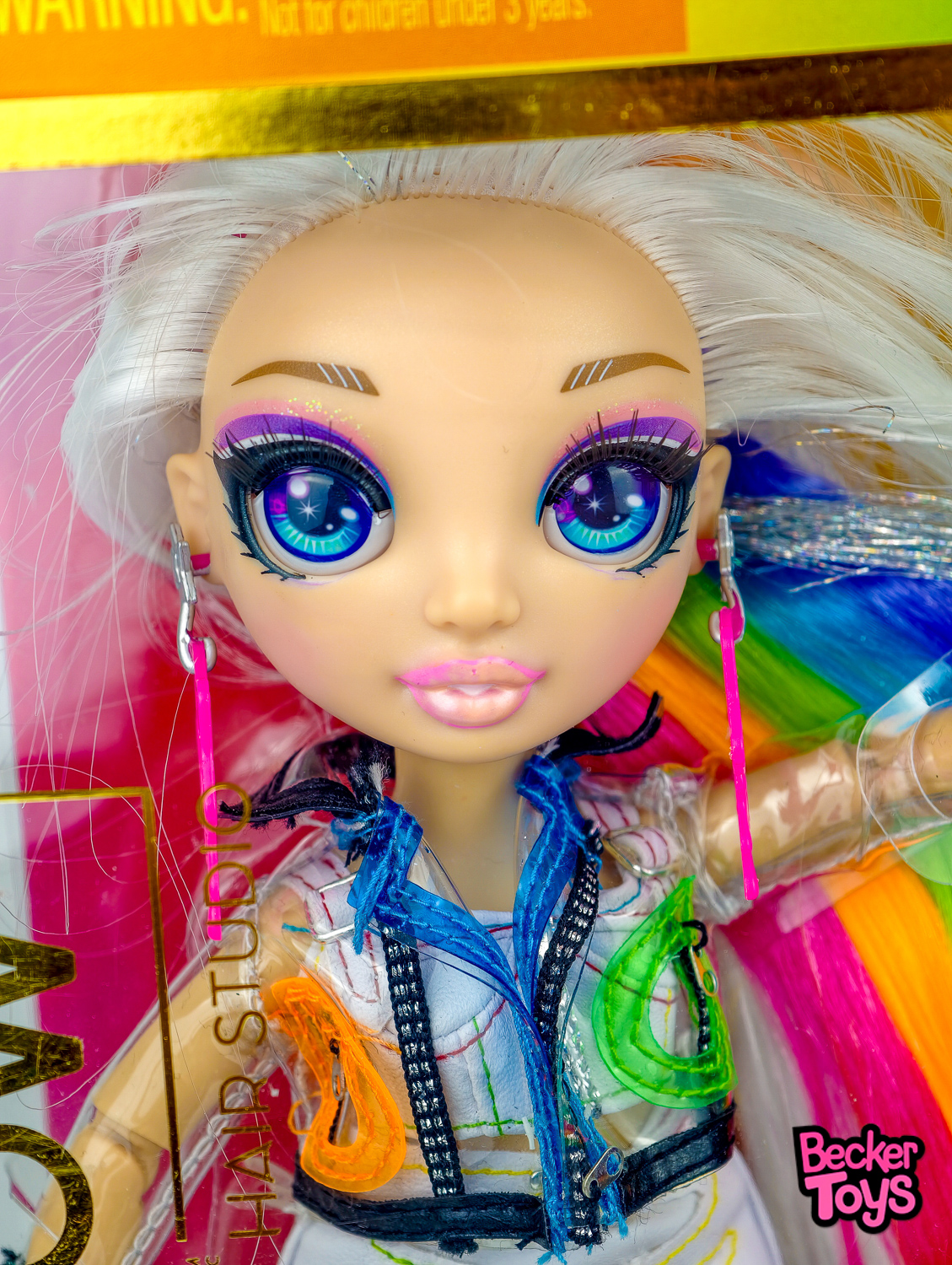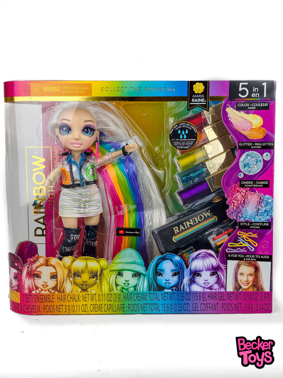 Amaya Raine luce su característico cabello extra largo en color blanco con mechones arcoíris, uno de los rasgos más icónicos del personaje. Su look tiene un aire moderno y atrevido, con una estética muy visual inspirada en la identidad multicolor de la marca. El conjunto se completa con accesorios de peluquería y coloración, incluyendo varios complementos para personalizar el peinado y reforzar el valor de esta edición frente a otras muñecas de la línea.